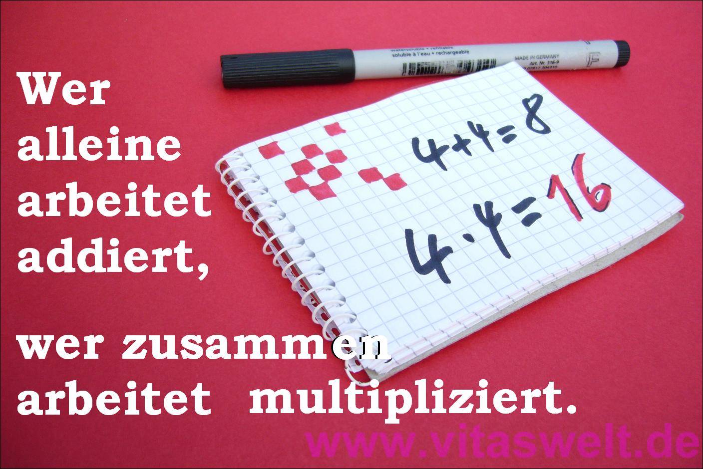 | A04 "Wer alleine arbeitet addiert, wer zusammen arbeitet multipliziert" weiß geschrieben auf rotem Untergrund. Darauf liegt ein Notizblöckchen worauf handschriftlich steht 4+4=8 und 4mal4 =16. Der Stift liegt über dem Block, so, als sei gerade erst geschrieben worden. Mail mit der Karte A04 versenden Karte A04 bestellen Karte A04 vergrößern | |