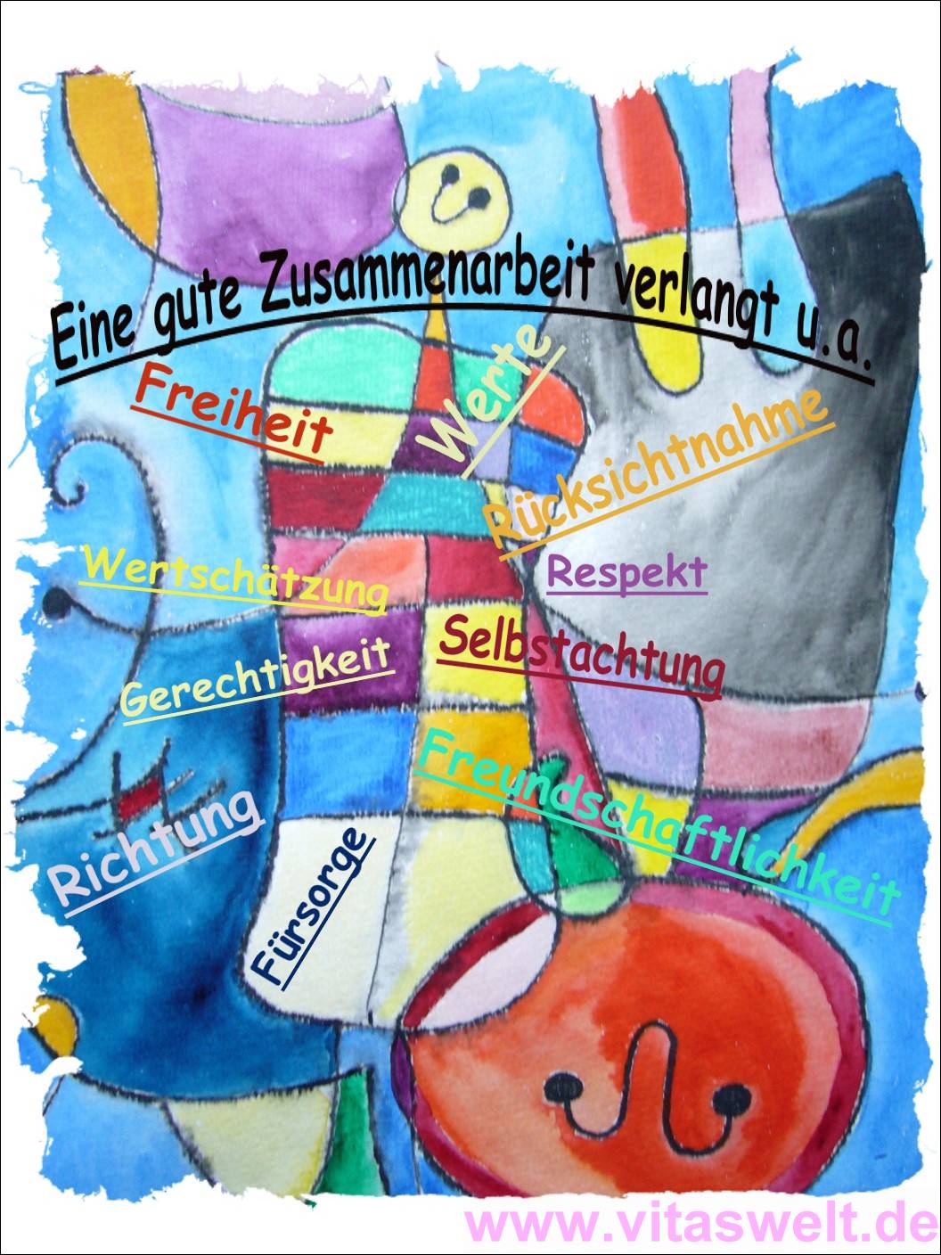 | A05** "Eine gute Zusammenarbeit verlangt u.a. Freiheit, Werte, Rücksichtnahme, Respekt, Wertschätzung, Gerechtigkeit, Richtung, Selbstachtung, Fürsorge, Freundschaftlichkeit" Diese Stichworte sind in verschiedenen Farben, die sich auch im Bildmotiv wiederfinden, um den Mittelpunkt der Karte angeordnet. Das Bild zeigt zwei ineinander verflochtene, kindlich gemalte Personen. Die Köpfe stehen sich gegenüber und die Körper sind in vielerlei Farben der Schnittpunkte ineinander verlaufen. Aquarell im Stil Miro`s . Farbenfroh wie das Leben. Mail mit der Karte A05 versenden Karte A05 bestellen Karte A05 vergrößern | |