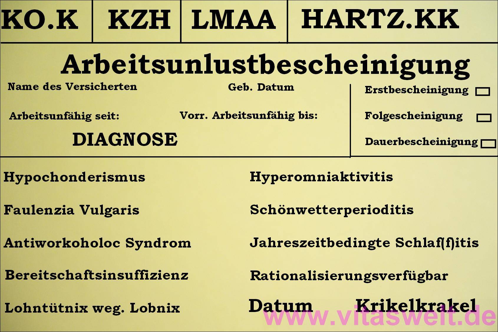 | A07 "Arbeitsunlustbescheinigung" Hier haben wir ein gelbes Formular (ähnlich dem Attest vom Arzt) entworfen. Man kann ankreuzen, welcher Krankenkasse (Ko.K , KZH, LMAA, HARTZ.KK) man angehört. Als Diagnose findet man folgende Ankreuzmöglichkeiten: Hypochonderismus, Faulenzia Vulgaris, Antiworkoholoc Syndrom, Bereitschaftsinsuffizienz, Lohntütnix we. Lobnix, Hyperomniaktivitis, Schönwetterperioditis, Jahreszeitbedingte Schlaf(f)itis, oder Rationalisierungsverfügbar. Gedacht für alle, die sich ständig aufopfern und mal eine Auszeit benötigen. Burnout Prophylaxe. Mail mit der Karte A07 versenden Karte A07 bestellen Karte A07 vergrößern | |