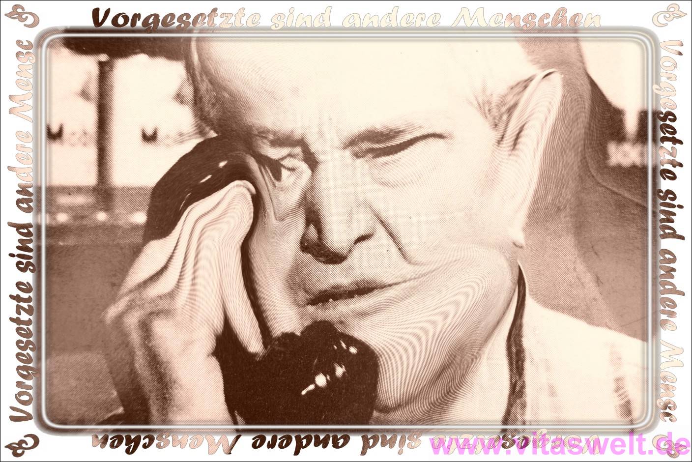 | A09 "Vorgesetzte sind andere Menschen" steht um eine Karte herum geschrieben. Abgebildet ist ein telefonierender Herr in sepia Farbton.Ohren, Hand, Mund und Auge haben wir etwas verzerrt, sodass das Gesicht etwas entfremdet wirkt. Ein kleiner Spaß, denn einer muss ja der Chef sein... Lachen befreit, oder? Mail mit der Karte A09 versenden Karte A09 bestellen Karte A09 vergrößern | |