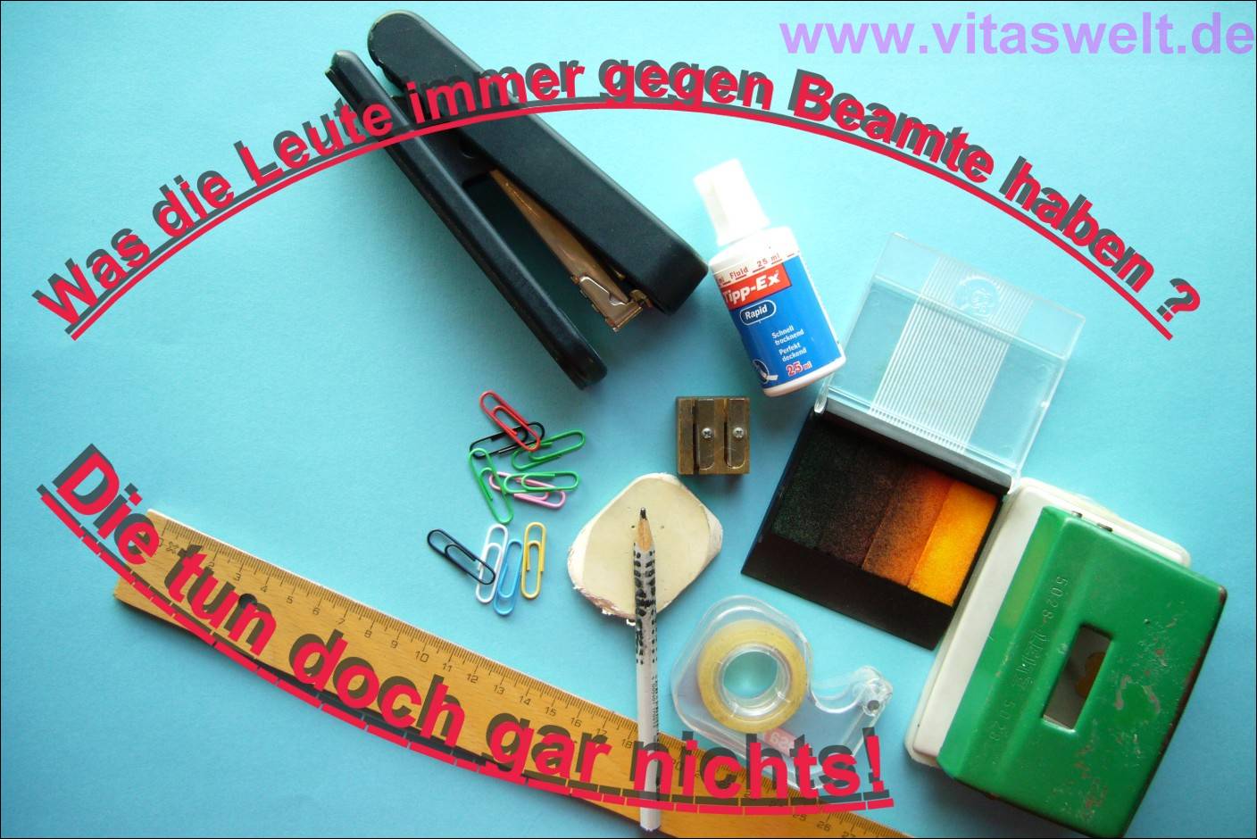 | A10 "Was die Leute nur gegen Beamte haben?. Die tun doch gar nichts!" Zwei im halbkreis und rot angeordnete Sätze über der Abbildung, die Büroutensilien vom Radiergummi über Tesafilm bis hin zum Tipex oder Stempelkissen zeigt. Hintergrund blau. Naja, es gibt von jeder Sorte Arbeitnehmer... Mail mit der Karte A10 versenden Karte A10 bestellen Karte A10 vergrößern | |