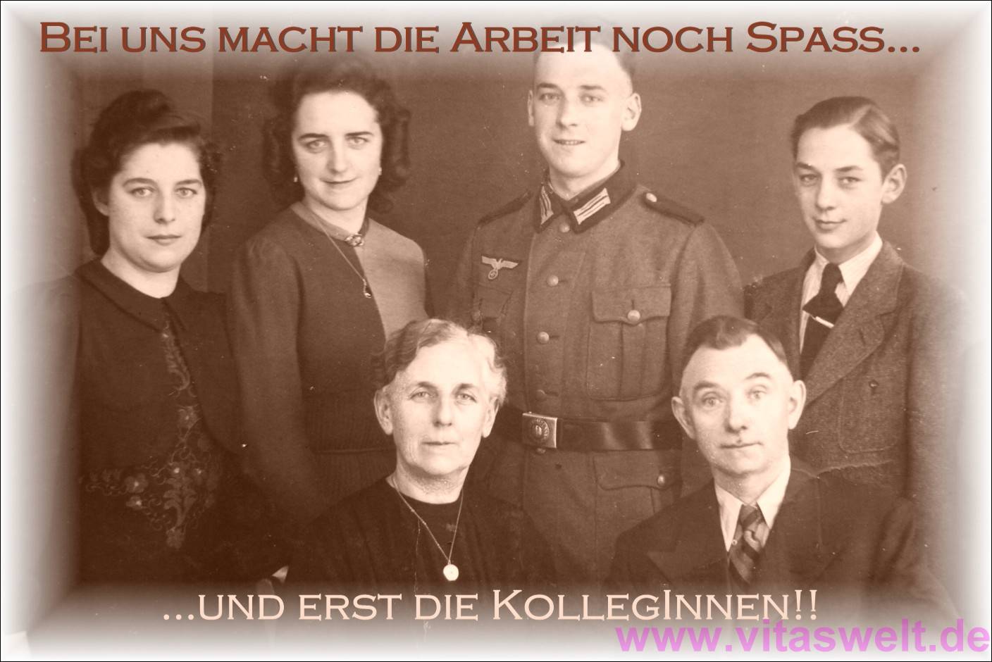 | A11 "Bei uns macht die Arbeit noch Spaß... ...und erst die KollegInnen!" Spruch oben und unten auf der Karte, welche 6 sehr unterschiedliche Personen bei einer Gruppenaufnahme zeigt. Stil der 50iger Jahre, sepiafarben und zum Rand hin immer blasser werdend. Kann man nehmen, wie man will. Mail mit der Karte A11 versenden Karte A11 bestellen Karte A11 vergrößern | |