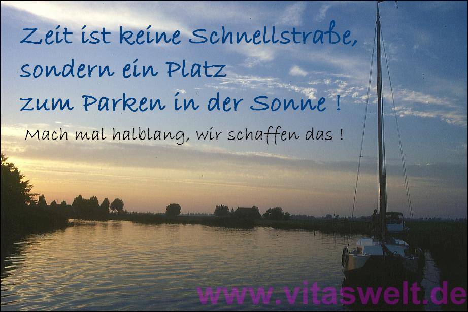 | A13 "Zeit ist keine Schnellstraße, sondern ein Platz zum Parken in der Sonne. Mach mal halblang, wir schaffen das!", steht auf dem blauen Himmel, unter dem sich ein Sonnenuntergang im Wasser spiegelt. Zu sehen ist im Dämmerlicht ein ruhiges Gewässer, auf dem ein abgetakeltes Seegelbot treibt. Der Horizont ist durch entfernten Baumbestand begrenzt. Strahlt Ruhe aus. Mail mit der Karte A13 versenden Karte A13 bestellen Karte A13 vergrößern | |