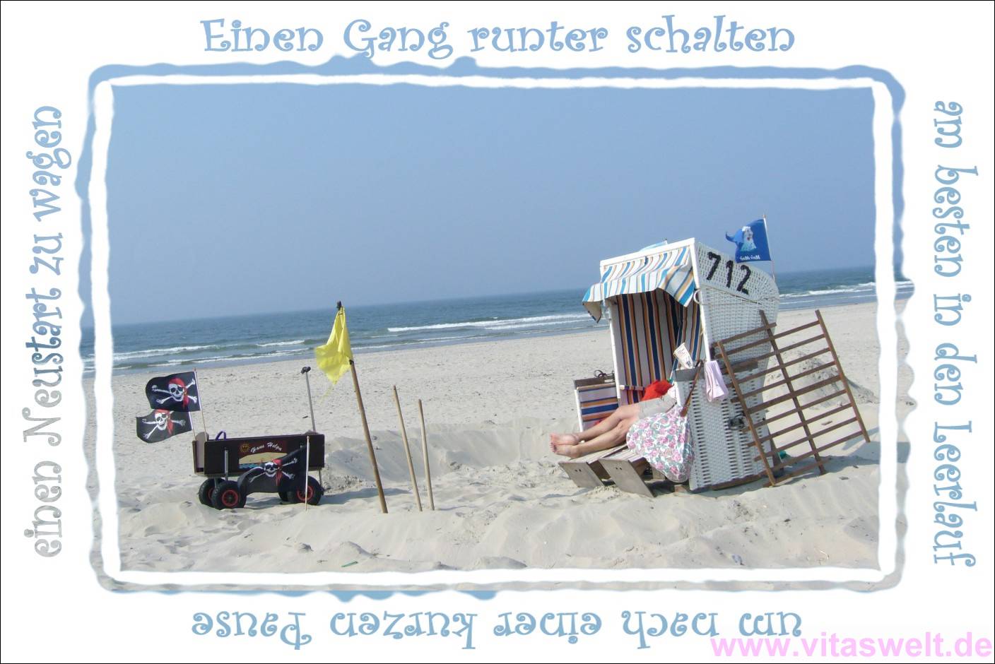 | A15 Auf dieser Karte sehen Sie einen blau-weißen Strandkorb, aus dem zwei nackte Beine, eine Hand und ein Buch herausschauen. Davor steckt eine gelbe Fahne im Sand, die den Eingang zur "Sandburg" markiert. Etwas daneben steht ein Bollerwagen, an dessen Ecken zwei schwarze Piratenfahnen flattern. Im Hintergrund sieht man die Brandung des Meeres und einen blauen Himmel. Um die Kartenkanten herum steht: "Einen Gang runter schalten, am besten in den Leerlauf, um nach einer kurzen Pause, einen Neustart zu wagen." Entspannung pur. Mail mit der Karte A15 versenden Karte A15 bestellen Karte A15 vergrößern | |