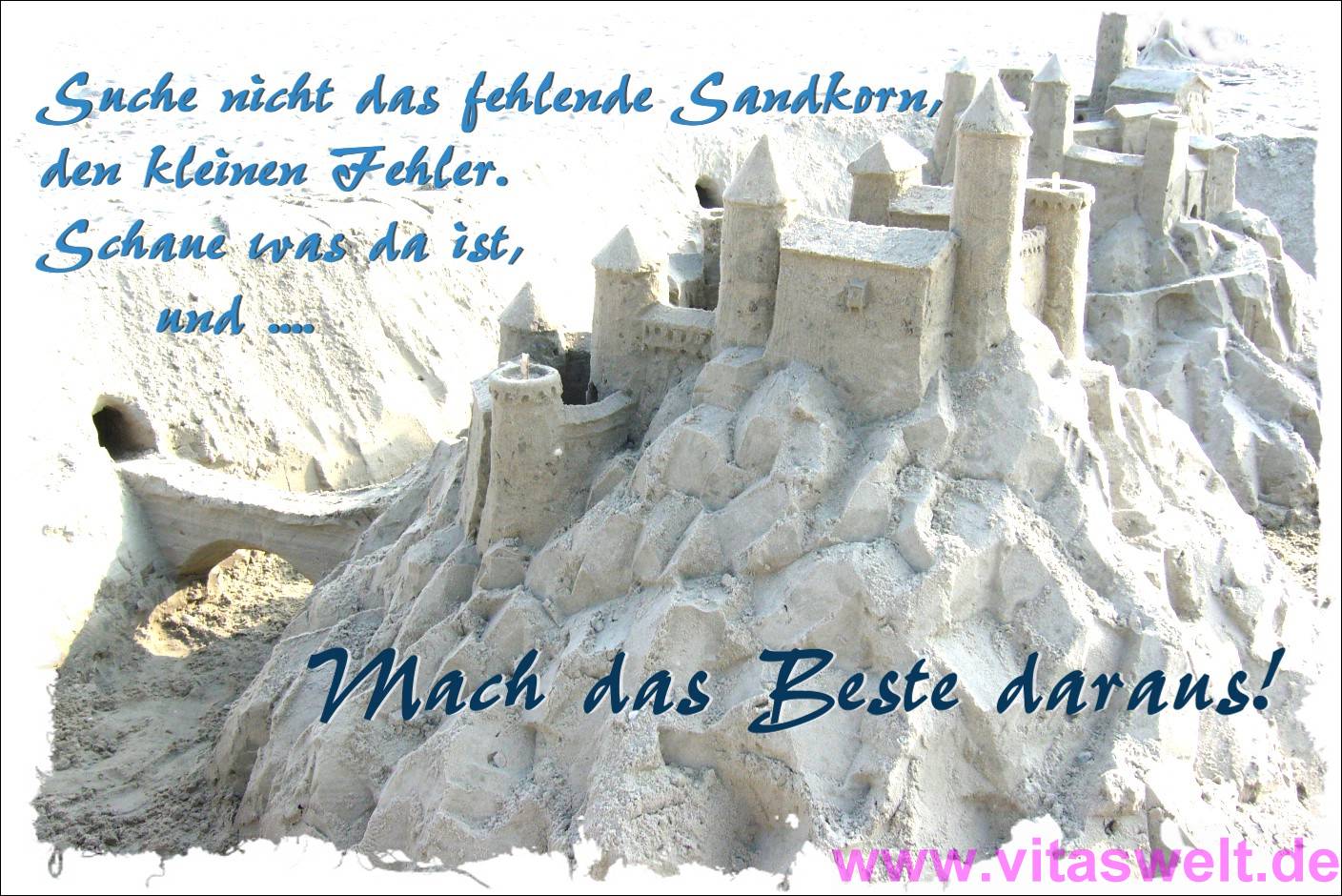 | A16 "Suche nicht das fehlende Sandkorn, den kleinen Fehler. Schaue, was da ist und... mach das Beste daraus!" Erster Teil des Spruches steht in hellblau oben links. Der zweite Teil, etwas größer und dunkler, unten rechts. Abgebildet ist eine aus Sand gebaute Burg mit Türmen und verschiedenhohen Gebäuden an einem Berg. Am unteren Teil des Berges befindet sich eine Brücke und ein Eingang. Der Berg selbst ist ebenfalls aus Sand gebaut und sieht hubbelig und steinig aus. Gebaut am Strand. Mail mit der Karte A16 versenden Karte A16 bestellen Karte A16 vergrößern | |