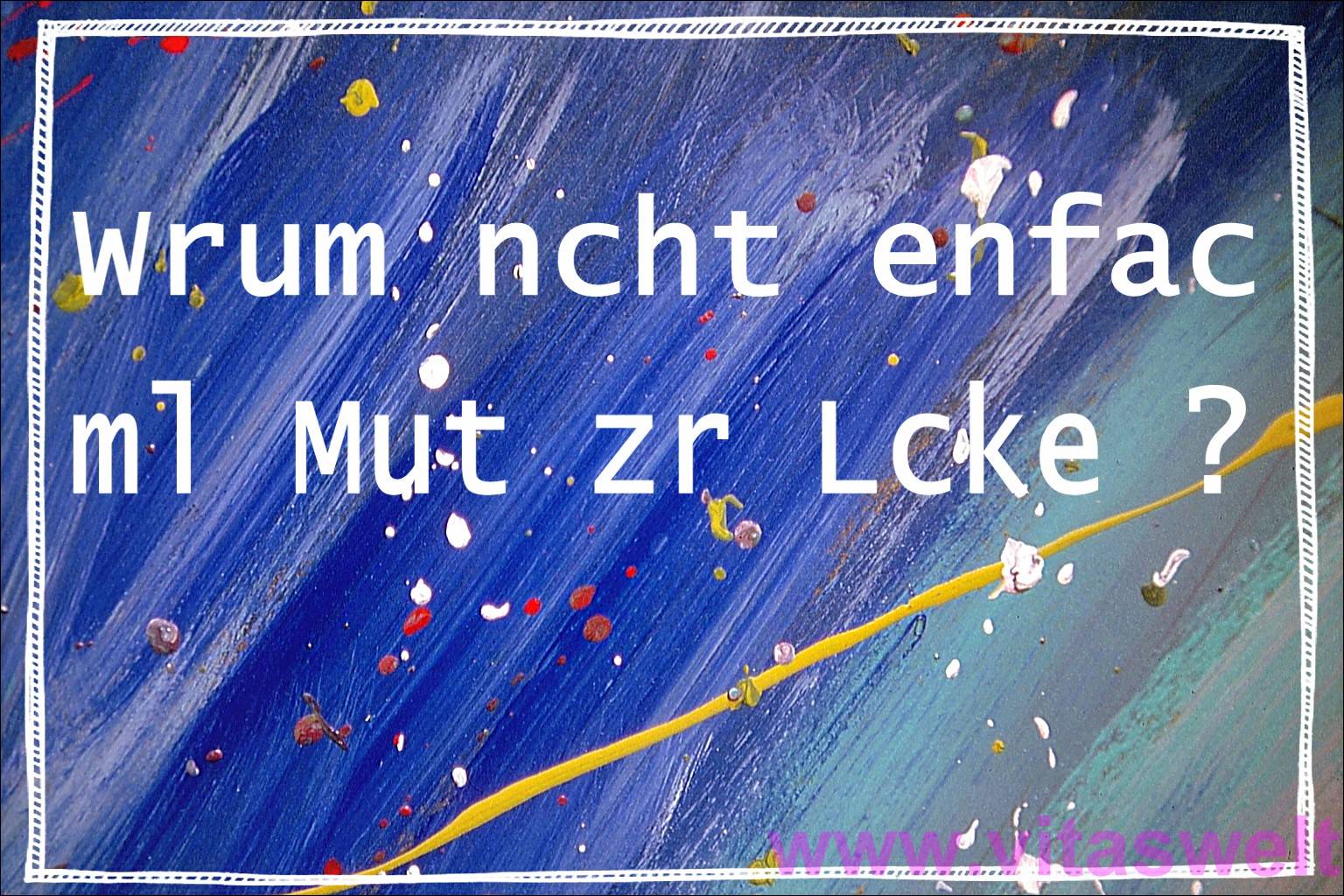 | A21 " Wrum ncht enfac ml Mut zr Lcke ?" Weiß geschriebener Spruch auf einem leuchtend- blauen bis türkis-farbenen Hintergrund. Der Ausschnitt eines auf Holz gemaltem Acrylbildes zeigt außerdem einige Farbspritzer in weißen, roten und gelben Farben. Ein gelber "Faden" durchquert das Bild von links unten nach rechts oben. Farbiger Blickfang. Und trotz Lücke lässt sich der Text lesen. Warum also nicht ? Mail mit der Karte A21 versenden Karte A21 bestellen Karte A21 vergrößern | |