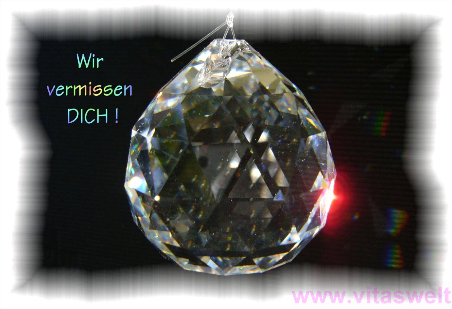 | A22** "Wir vermissen DICH!" steht oben links untereinander in einer Schrift, die sich farblich von innen nach außen in Regenbogenfarben verändert. Der Hintergrund ist schwarz und der Kartenrand ungleichmäßig blasser werdend. In der Mitte glitzert eine mit hunderten von Facetten geschliffene Glaskugel (Sonnenfänger), die von der Sonne beschienen wird. Dadurch glitzern viele Facetten silbrig oder in zarten Regenbogenfarben. Am rechten unteren Rand der Kugel blitzt die Sonne gerade ganau so auf einen Schliff, dass ein rot strahlender Blickpunkt entsteht. Beim Drehen dieser Sonnenfänger in der Sonne entstehen oft noch viele andere "Farbblitzer". Mail mit der Karte A22 versenden Karte A22 bestellen Karte A22 vergrößern | |