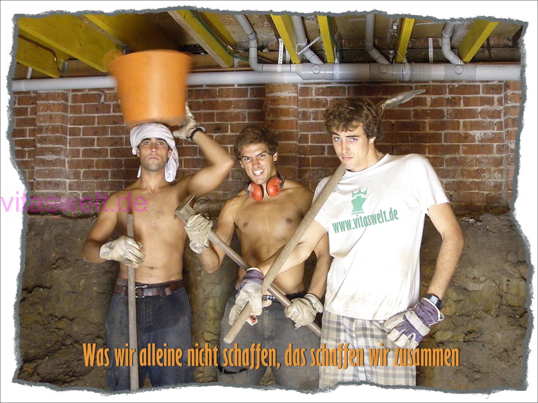 | A24 In einem Kellerrohbau stehen drei junge Kerle, die dort zusammen arbeiten. Im Hintergrund sieht man das Ziegelstein Mauerwerk und die Erde, sowie die an der Decke verlegten Kabel und Rohre. Alle drei schauen herausfordernd und verbissen kämperisch, aber auch mit einem gewissen Schalk im Nacken in die Kamera. Die Person links trägt einen weißen Turban und balanciert darauf einen orangenen Eimer, den er mit der linken Hand festhält. In der rechten Hand hält sie den Stiel einer Schaufel. Sie hat eine blaue Hose und einen muskulösen freien Oberkörper. Das gilt auch für die mittlere Person, die eine stählerne Stützstrebe diagonal vor dem Körper hält. Um den Hals trägt sie orangefarbene Ohrschützer. Man sieht die Zähne, gleichsam als ob diese Person "Grrrr!" macht. Die Person rechts trägt ein weißliches T-Shirt und stützt die linke Hand in die Hüfte. In der Rechten trägt sie locker eine Schaufel über die Schulter nach hinten. Alle drei tragen Arbeitshandschuhe. Motivation Pur! Einfach genial. Darunter der Spruch:"Was wir alleine nicht schaffen, das schaffen wir zusammen!" Mail mit der Karte A24 versenden Karte A24 bestellen Karte A24 vergrößern | |