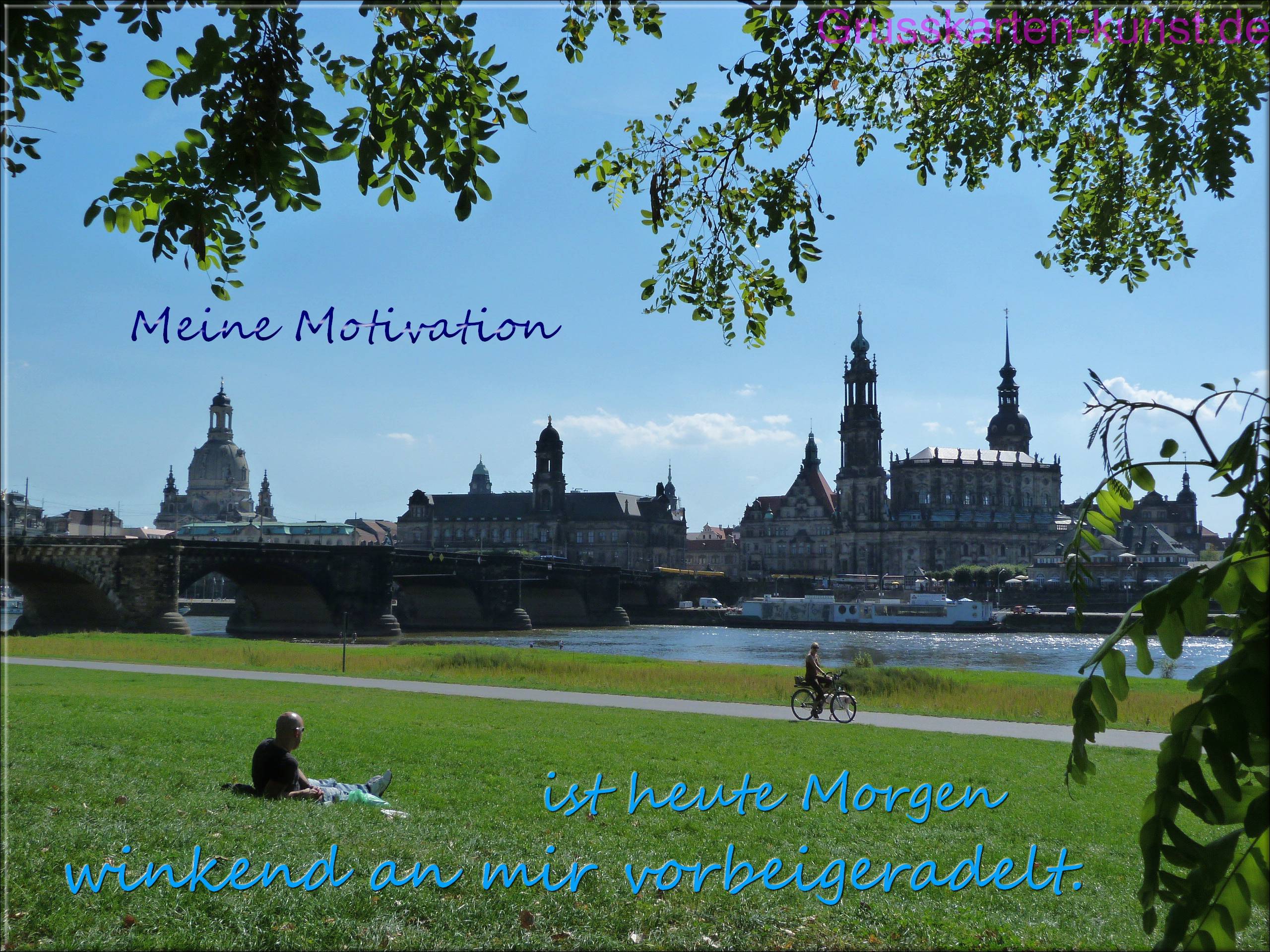 | A27 "Meine Motivation... ist heute Morgen winkend an mir vorbeigeradelt." steht auf dieser Karte, auf der im Vordergrund ein Mann, auf den Ellebogen gestützt, auf einer Wiese liegt und in die Ferne schaut. Dort sieht er vor der Dresdner Altstadtkulisse (Frauenkirche, Rathaus, Hofkapelle, Semperoper) die Elbe behäbig unter einer Brücke vorbeifließen. Auf dem Radweg fährt eine Radlerin lässig einarmig an der Szenerie vorbei. Der blaue Himmel wird oben von Blattgrün gesäumt. Mail mit der Karte A27 versenden Karte A27 vergrößern | |