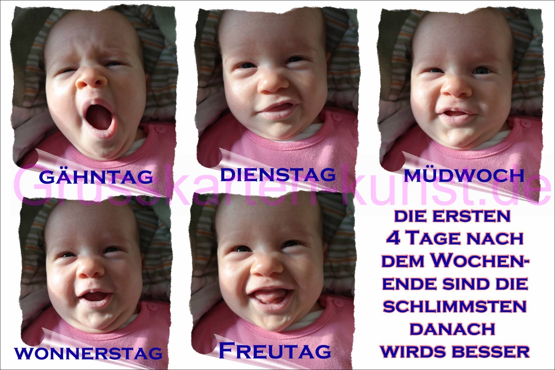 | A29 "Die ersten 4 Tage nach dem Wochenende sind die Schlimmsten, danach wirds besser." steht im rechten unteren Feld einer in 6 Teile aufgeteilten Karte. Die anderen Felder von links oben bis Mitte unten zeigen jeweils ein Babygesicht. Darunter steht in blauer Schrift Gähntag (Das Baby gähnt) Dienstag (Das Baby blinzelt mit dem rechten Auge und zieht den Mundwinkel hoch), Müdwoch (Es blinzelt mit dem linken Auge und zieht die Lippen kraus), Wonnerstag (Es beginnt zu Lächeln und zieht die Nase kraus), Freutag (Es strahlt und lacht einen an und zeigt seine Zunge). Dies ist eine Serie mit immer gleichem Ausschnitt und rosafarbenem Shirt, innerhalb von ca. 1 Minute beim Aufwachen des Babys aufgenommen. Beeindruckend zum Schmunzeln, erfrischend, einfach toll. Für Montagsmuffelige KollegInnen Mail mit der Karte A29 versenden Karte A29 vergrößern | |
