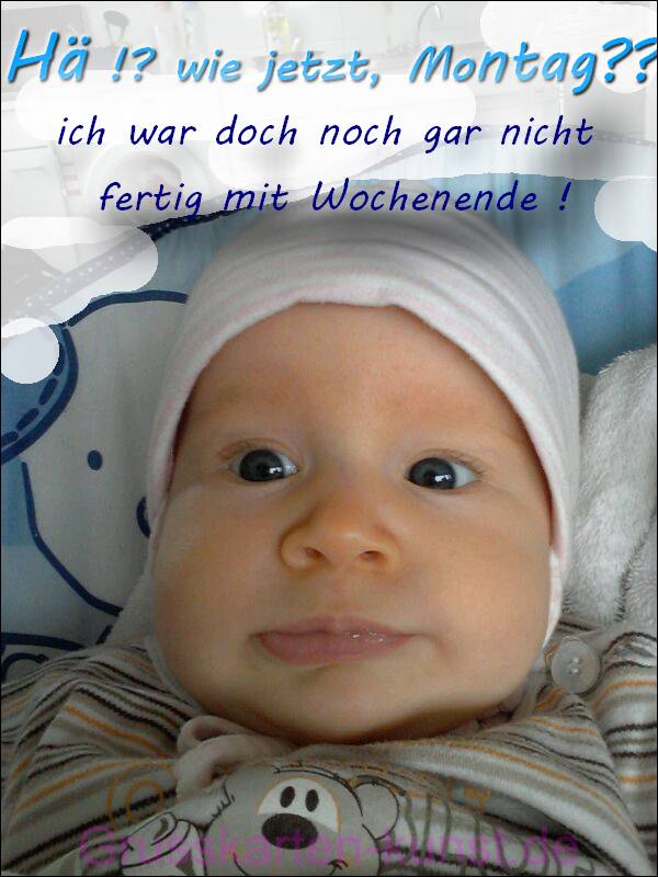 | A30 "Hä?! Wie schon Montag ?? Ich war doch noch gar nicht fertig mit Wochenende !" steht oben auf der Karte. Zu sehen ist ein Babygesicht mit heller Mütze und Mäuschenpulli, auf einem Kissen liegend. Stupsnase, Pausbäckchen, blaue Augen und ein leicht hängender Mundwinkel. Sie guckt ein wenig "deppert" wie ein Fragezeichen drein. Hä ? süß und zum Schmunzeln. Mail mit der Karte A30 versenden Karte A30 vergrößern | |