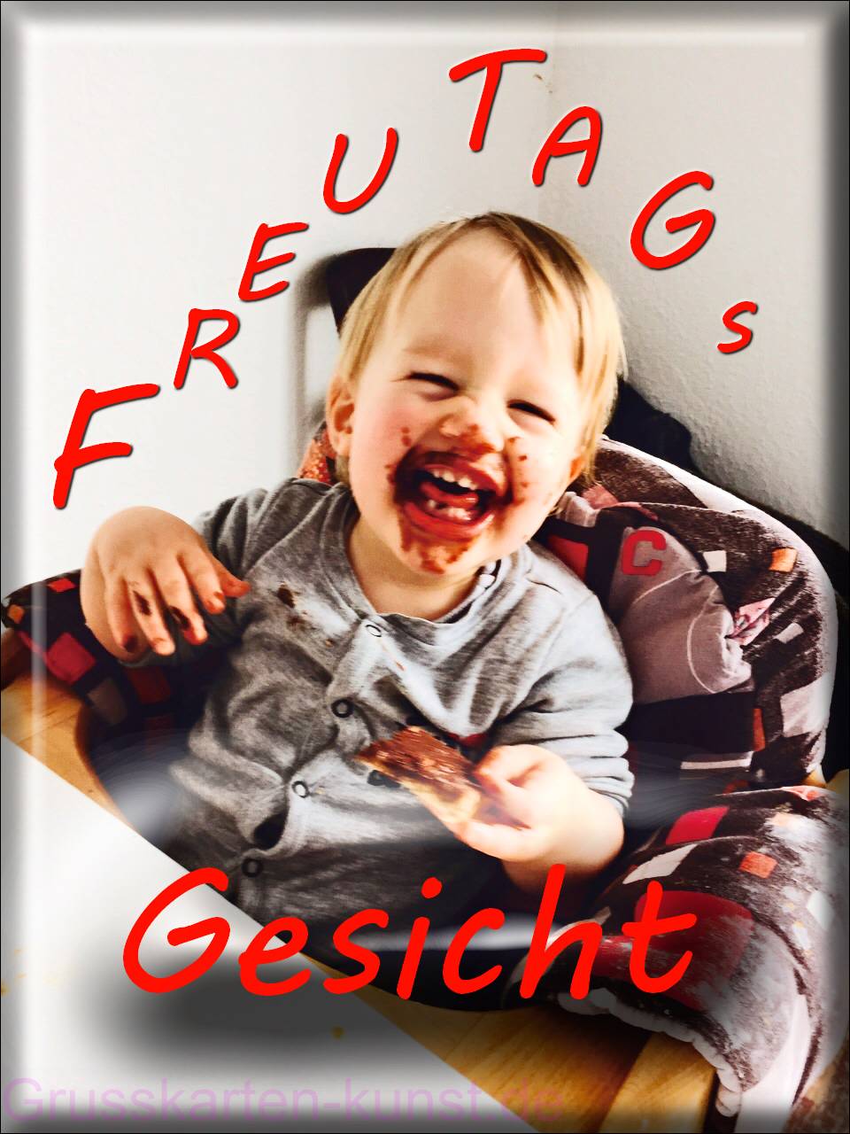 | A31 "Freutags- Gesicht" steht in dicken roten Druckbuchstaben auf der Karte, auf der ein 14 Monate altes, blondes Kind mit komplett Nutella verschmiertem Gesicht, herzhaft laut, in die Kamera lacht und sein Nutella Brot festhält. Ansteckend frech, frisch, fröhlich. Mail mit der Karte A31 versenden Karte A31 vergrößern | |