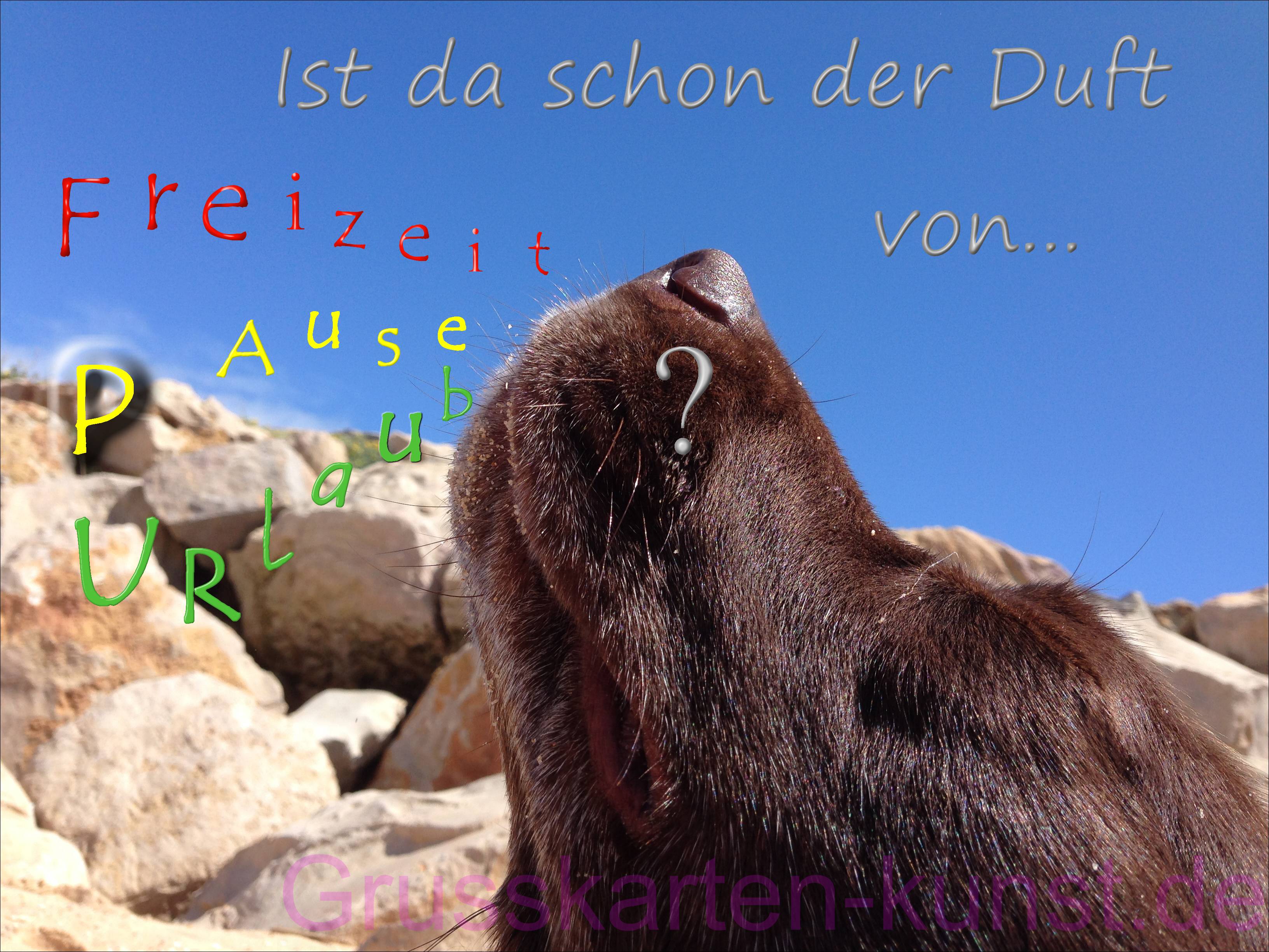 | A32 "Ist da schon der Duft von.... Freizeit... Pause.... Urlaub...? steht in wellenförmig angeordneten Buchstaben und bunter Schrift auf der Karte. Diese zeigt eine braune Hundeschnauze und Nase, die sich von rechts unten nach links oben in den blauen Himmel streckt. Im unteren Bereich des Hintergrundes liegen unscharf einige Felsbrocken. Man sieht den Teil des Hundekopfes im Profil, das so zu sehende Auge ist geschlossen. Mail mit der Karte A32 versenden Karte A32 vergrößern | |
