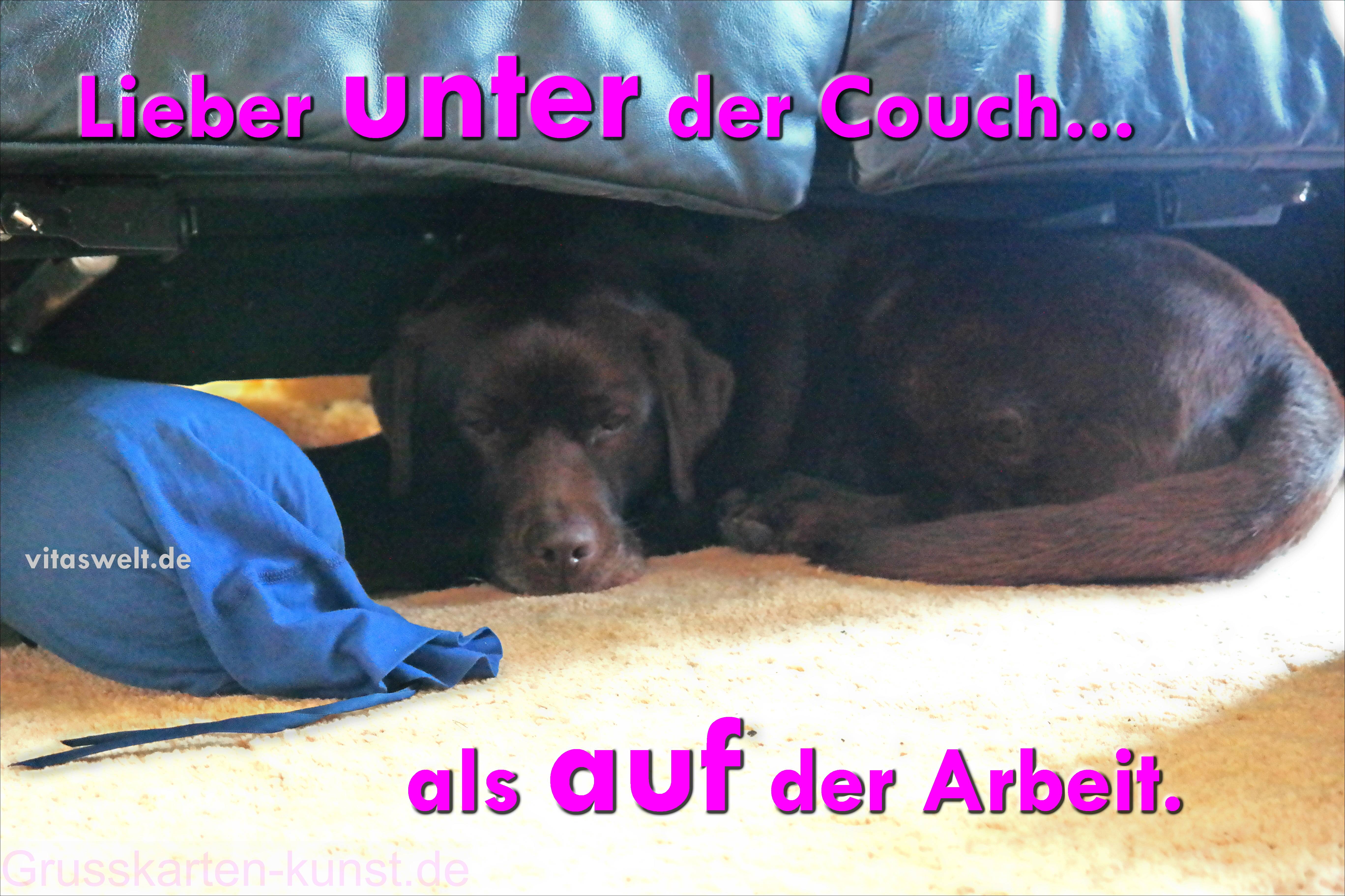 | A33 In pinkfarbenen Druckbuchstaben oben: "Lieber unter der Couch" unten: "als auf der Arbeit." Diese Karte ist fototechnisch eher miserabel, aber man kann den Hund, der sich unter einer schwarzen Couch auf dem hellen Teppich zusammengerollt hat und schlaftrunken den Fotografen betrachtet gut erkennen. Hier geht es eher um den "Witz" Freude beim Versenden ! Mail mit der Karte A33 versenden Karte A33 vergrößern | |