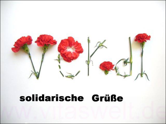| A01 "solidarische Grüße" steht in schwarzer Schrift unter einem filigranen ver.di (Vereinte Dienstleistungsgewerk-schaft) Schriftzug. Geschrieben ist ver.di mit roten Nelken mitsamt Stielen und Blättern. Runde Teile der Buchstaben sind mit den Blüten, gerade Teile mit den Stengeln geschrieben. Auf den zwei Strichen vom V, sowie beim Punkt und i ,sitzt jeweils eine Blüte. Hübscher Anblick auf weißem Grund. Mail mit der Karte A01 versenden Karte A01 bestellen Karte A01 vergrößern | |