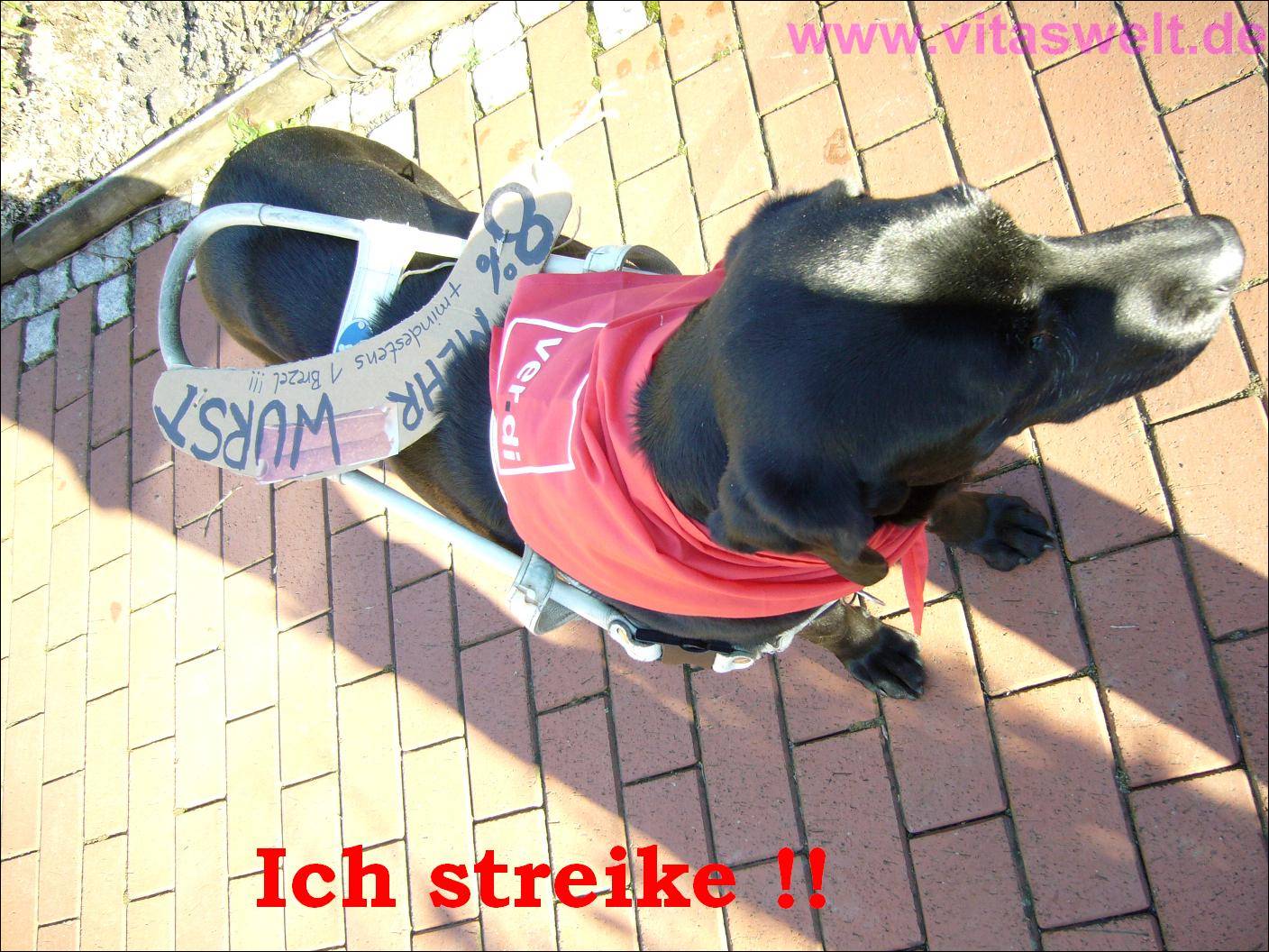 | A02 "Ich streike!" Hier sehen Sie meine schwarze Labrador- hündin mit einem roten ver.di Halstuch. Auf dem Rücken trägt sie eine braune Pappwurst, auf dieser steht: 8% mehr Wurst und mindestens eine Brezel. Streikfoto aus 2008. Mail mit der Karte A02 versenden Karte A02 bestellen Karte A02 vergrößern | |