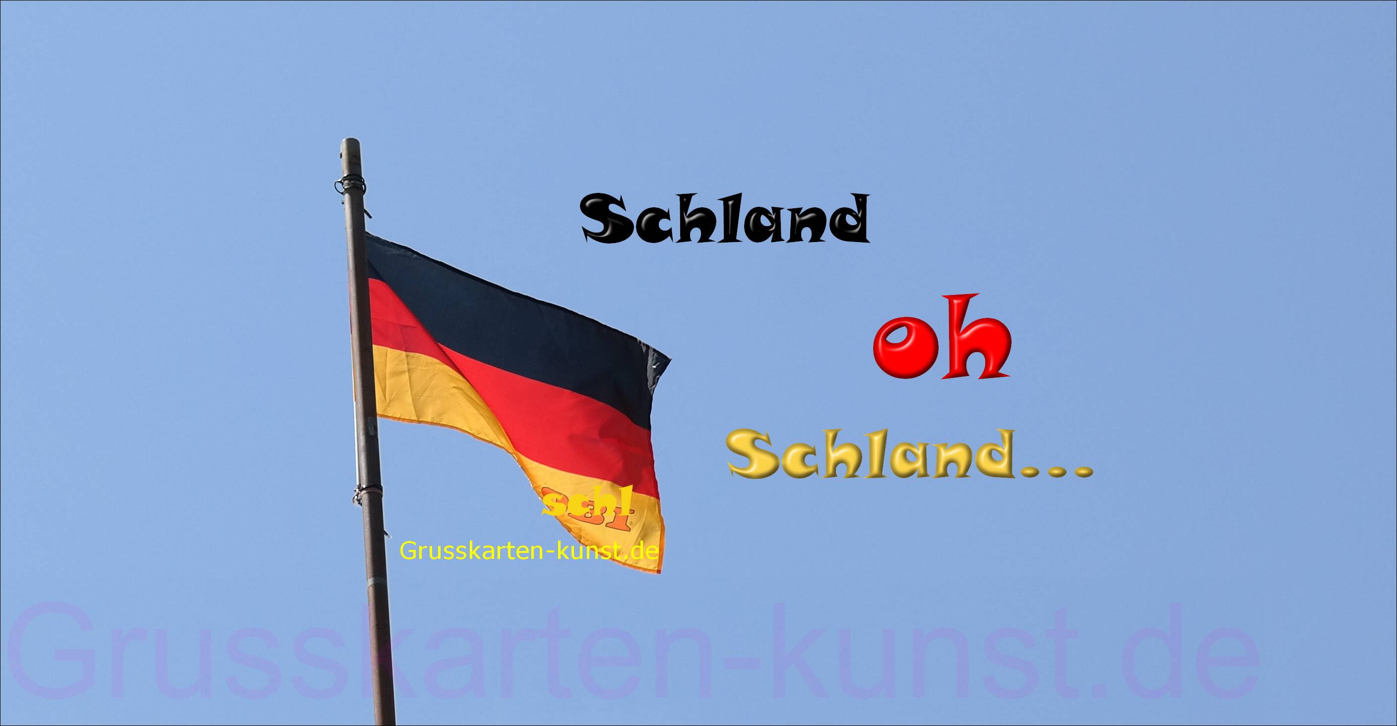 | C 21 "Schland oh Schland" steht in schwarz rot goldener Schrift neben einer ebensolchen Fahne, die vor einem himmelblauen Hintergrund am Mast flattert. Sollten Sie von Schland enttäuscht sein, sehen Sie unter C22 die Alternativkarte. Mail mit der Karte C21 versenden Karte C21 vergrößern | |