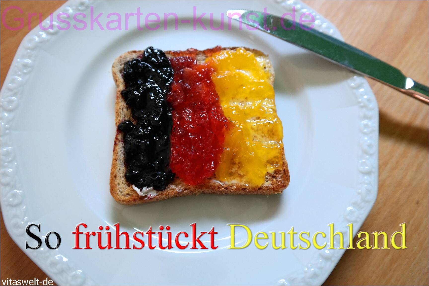 | C23 "So frühstückt Deutschland" steht in schwarz rot goldener Schrift am unteren Rand der Karte. Man sieht ein Toastbrot auf einem weißen Teller und einem Holztisch. Das Toastbrot ist beschmiert mit schwarzer Blaubeer, roter Erdbeer und goldgelber Mangomarmelade. Daneben liegt ein Messer. Schmunzel Mail mit der Karte C23 versenden Karte C23 vergrößern | |