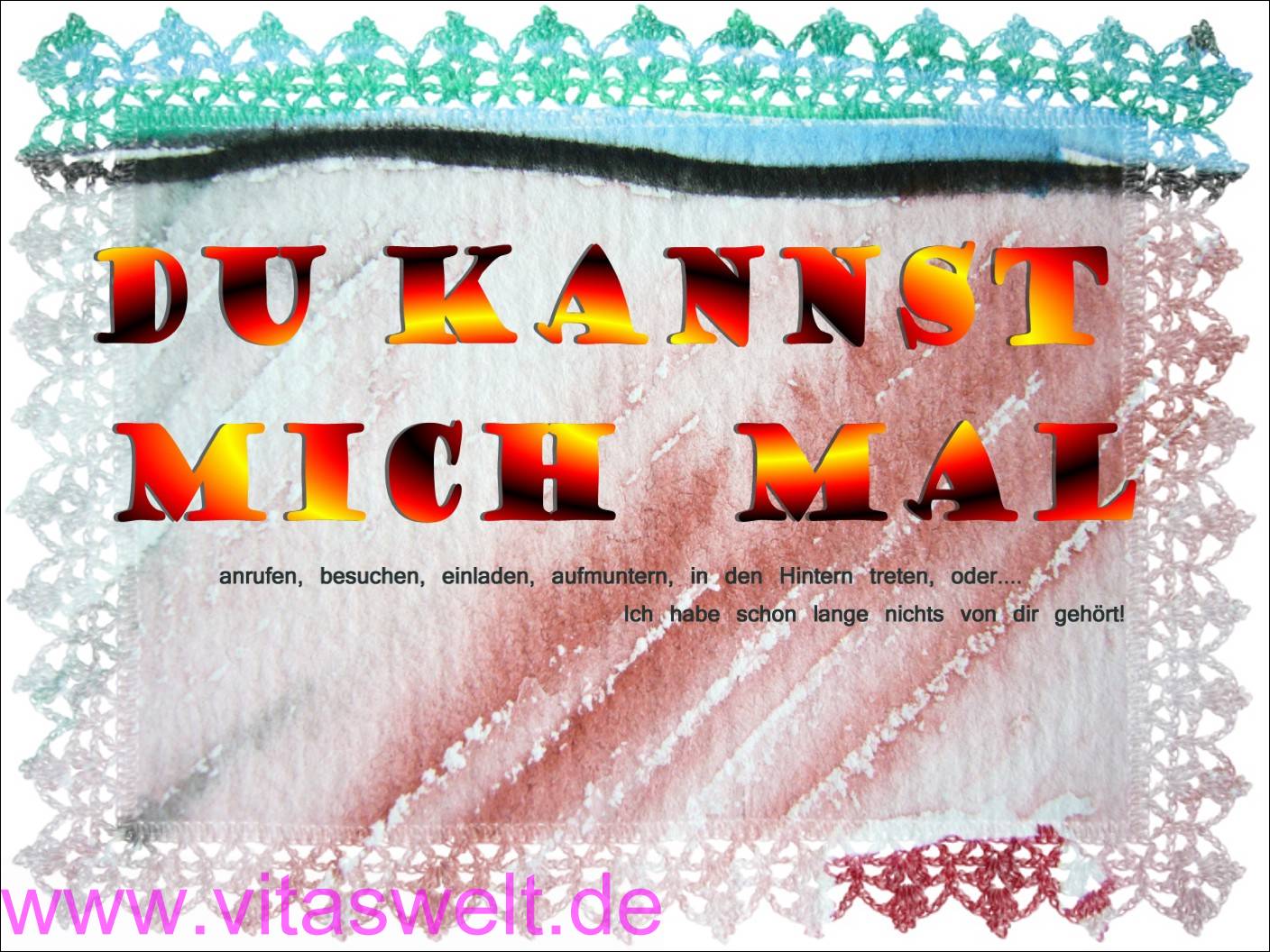 | C01** "Du kannst mich mal!" steht ganz groß und mit ineinander verlaufender Farben rot, gelb, schwarz. Darunter steht schwarz und klein: "anrufen, besuchen, einladen, aufmuntern, in den Hintern treten, oder... - Ich habe schon lange nichts von dir gehört." Das ganze ist auf einer Aquarellkarte geschrieben, die Beige- Brauntöne und ein wenig Grün- Blautöne abbildet. Der Kartenrand ist in den gleichen Farben, wie ein Spitzendeckchen gehalten. Frech und lustig. Mail mit der Karte C01 versenden Karte C01 bestellen Karte C01 vergrößern | |