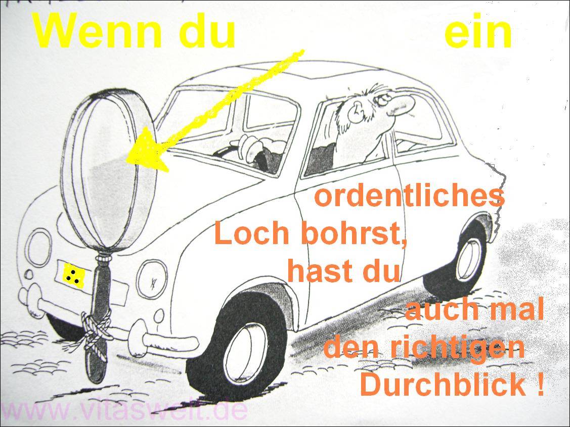 | C03 "Wenn du ... ein ordentliches Loch bohrst, hast du auch mal den richtigen Durchblick." Statt des Wortes "hier" ist ein Pfeil in die Richtung einer überdimensional großen Lupe gezeichnet. Die Lupe ist vor die Zeichnung eines Autos geschnallt, in dem Eine Comicperson durch das Seitenfenster schaut. Auf dem gelben Nummernschild sind drei schwarze Punkte abgebildet. Schwarz-weiß- Zeichnung mit gelb und orangefarbener Schrift. Für Sehlinge, die auch mal ins Leere greifen... Mail mit der Karte C03 versenden Karte C03 bestellen Karte C03 vergrößern | |