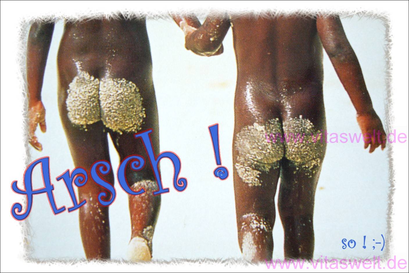 | C05 ** "Arsch!" In Lila Schrift quer über die Karte geschrieben. Die Abb. zeigt zwei nackte, braune Kinderrückenseiten von der Schulter bis zum Knöchel. Die beiden Hintern sind mit hellem Sand vom Strand besträuselt. Einfach witzig, oder? Mail mit der Karte C05 versenden Karte C05 bestellen Karte C05 vergrößern | |