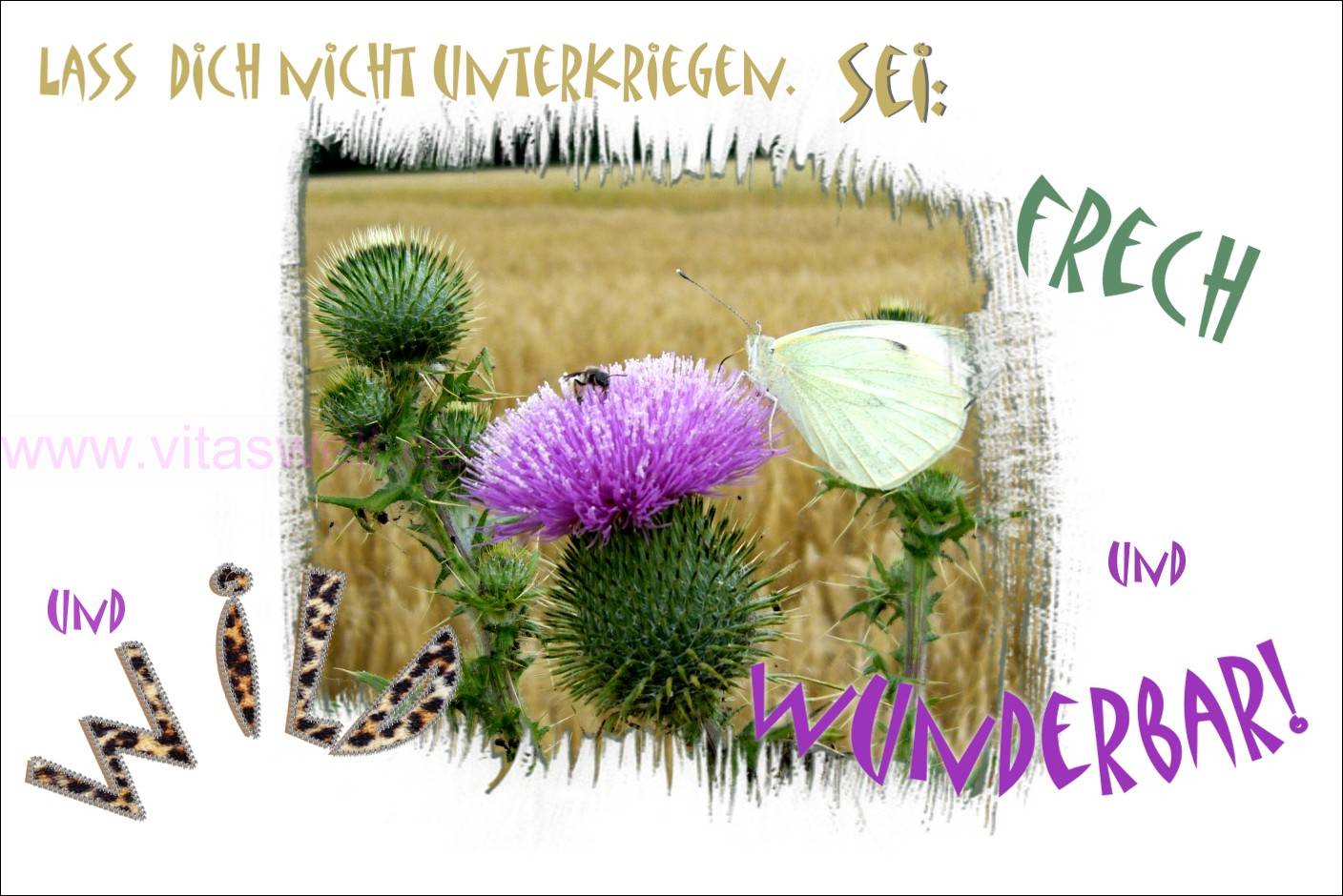 | C06 "Lass dich nicht unterkriegen. Sei: Frech und wild und wunderbar!" Die Worte frech, wild wunderbar sind verschiedenfarbig und groß, kreuz und quer auf der Karte angeordnet. Wild ist in Leopardenmuster geschrieben, ansonsten spiegeln sich die Farben des Motives wieder. Die Überschrift steht oben in Kornfeld- Farbe. Die Karte ist außenherum weiß und die Abbildung in der Mitte ist an den Rändern etwas ausgefranst. Die Schrift ragt teilweise in das Motiv hinein. In der Bildmitte beginnt eine zartlila Distel zu blühen. Dort sitzt ein weißlicher Schmetterling (Kohlweißling) und labt sich am Nektar. Mitten auf der Blüte sitzt auch noch eine Biene. Die Blüte sitzt wie ein Hut auf der kreisrunden, stachelig-grünen Frucht der Distel. Im Hintergrund sind weitere Stachelige Kugeln unscharf zu erkennen. Im Hintergrund ein goldgelbes Kornfeld. Wild und wunderbar! Mail mit der Karte C06 versenden Karte C06 bestellen Karte C06 vergrößern | |