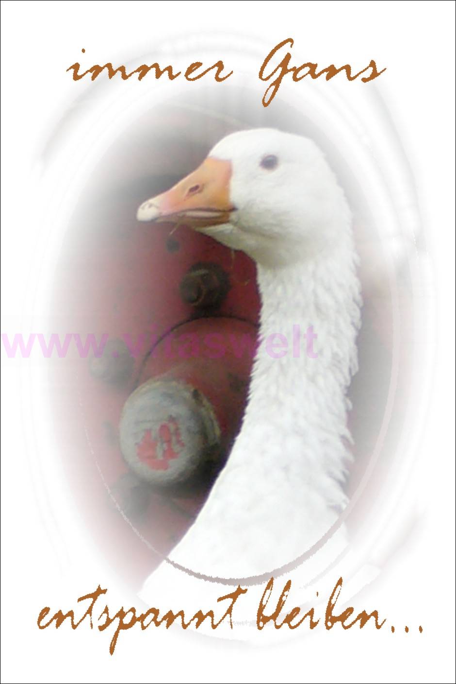 | C11 "Immer Gans entspannt bleiben" Oben und unten auf der ovalen Hochkantkarte, die nach außen hin blasser wird. Im Oval schaut einen frech und herausfordernd eine Gans an. Von ihr sieht am den weißen, langen Hals und den nach links guckenden Kopf mit dem orangenen Schnabel. Das runde "Knopfauge" schaut bestechend beobachtend. Mail mit der Karte C11 versenden Karte C11 bestellen Karte C11 vergrößern | |