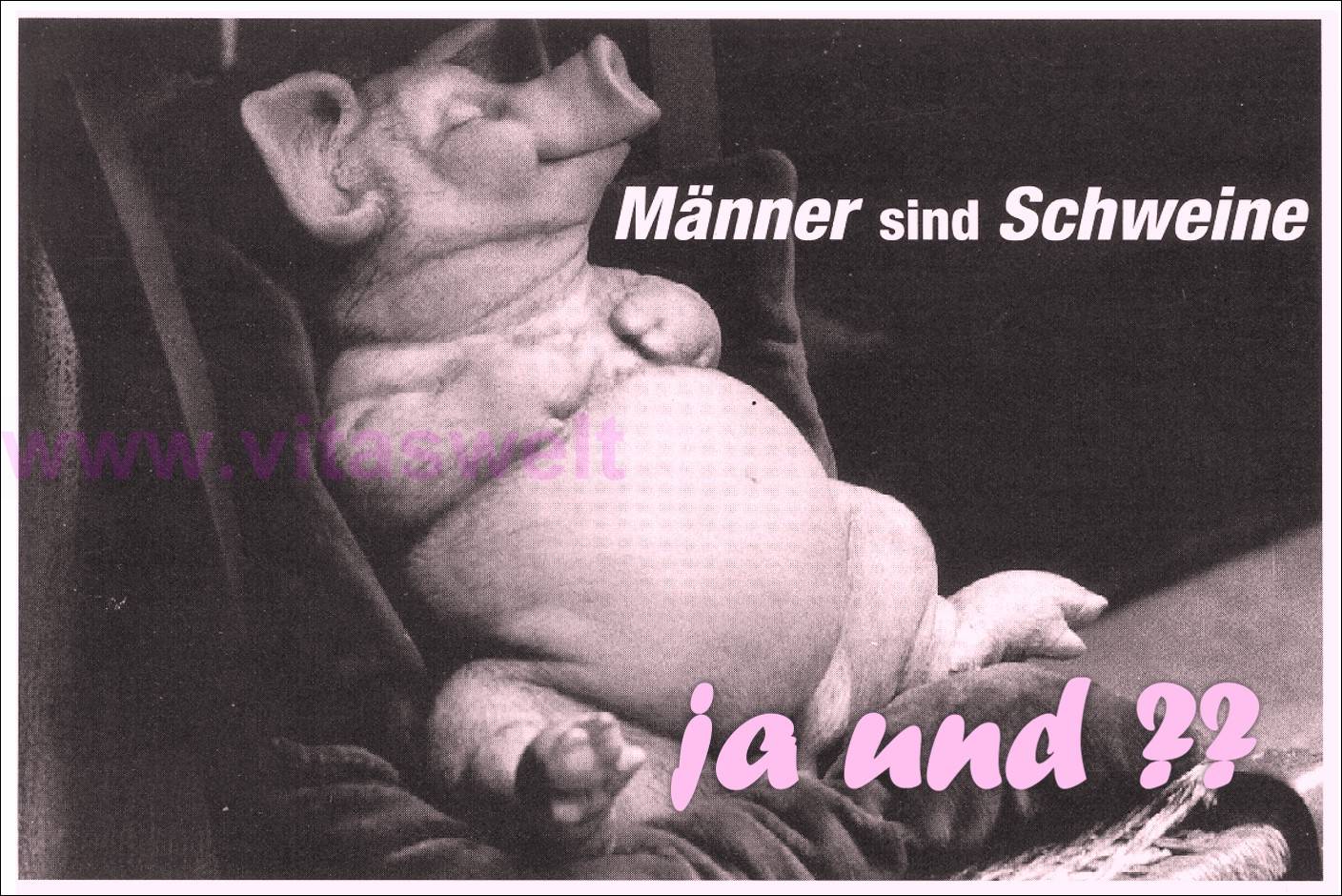 | C12 "Männer sind Schweine" - "Ja und??" Eine rosa colorierte s/w Karte zeigt ein größeres Ferkel, welches schlafend auf einem Sessel zu liegen scheint. Die zufrieden vor den dicken Bauch gehaltenen Vorderpfoten und die nach unten ausgestreckten Hinterpfoten unterstreichen den fast lächelnden Gesichtsausdruck. Der erste Teil des Spruches steht in weiß etwas kleiner rechts oben. In Schweinchenrosa und aufgeplustert steht der zweite Teil unten rechts. Ich glaube, in diesem Sinne können wir Eber das unterstützen. Abfotografiert und bearbeitet. Mail mit der Karte C12 versenden Karte C12 bestellen Karte C12 vergrößern | |