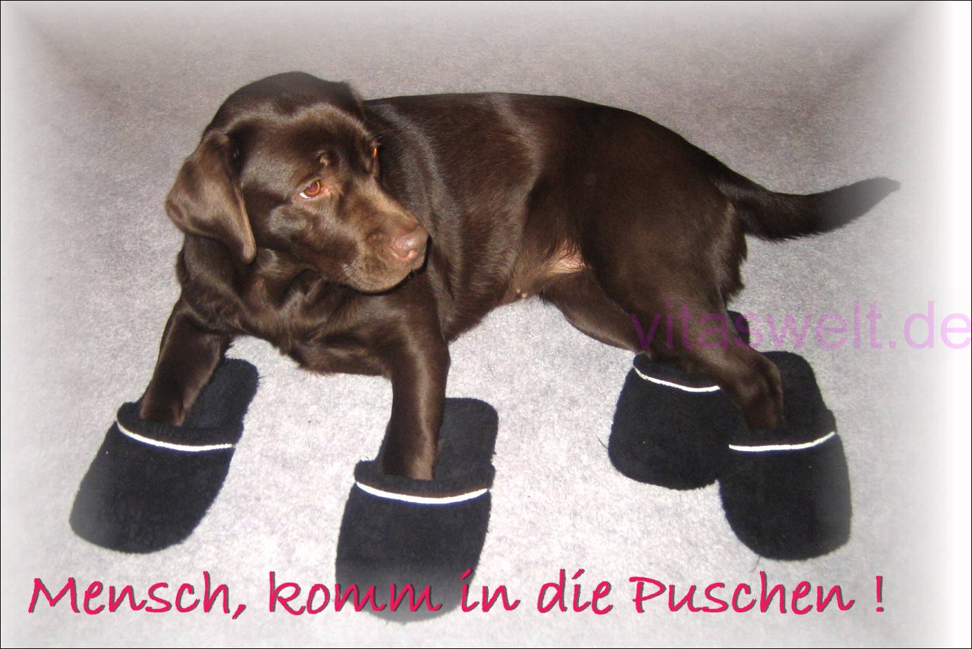 | C14 "Mensch, komm in die Puschen!" steht in rotlila Schrift unten auf der Karte. Diese zeigt einen moccabraunen Labrador, der auf seiner rechten Seite liegt und entspannt in Richtung der rechten Kartenseite schaut. Der Clou: Die 4 Pfoten stecken allesamt in 4 schwarz weißen Hausschuhen. Pfiffiger Hinweis- wer kann da schon wiederstehen ?! Mail mit der Karte C14 versenden Karte C14 bestellen Karte C14 vergrößern | |