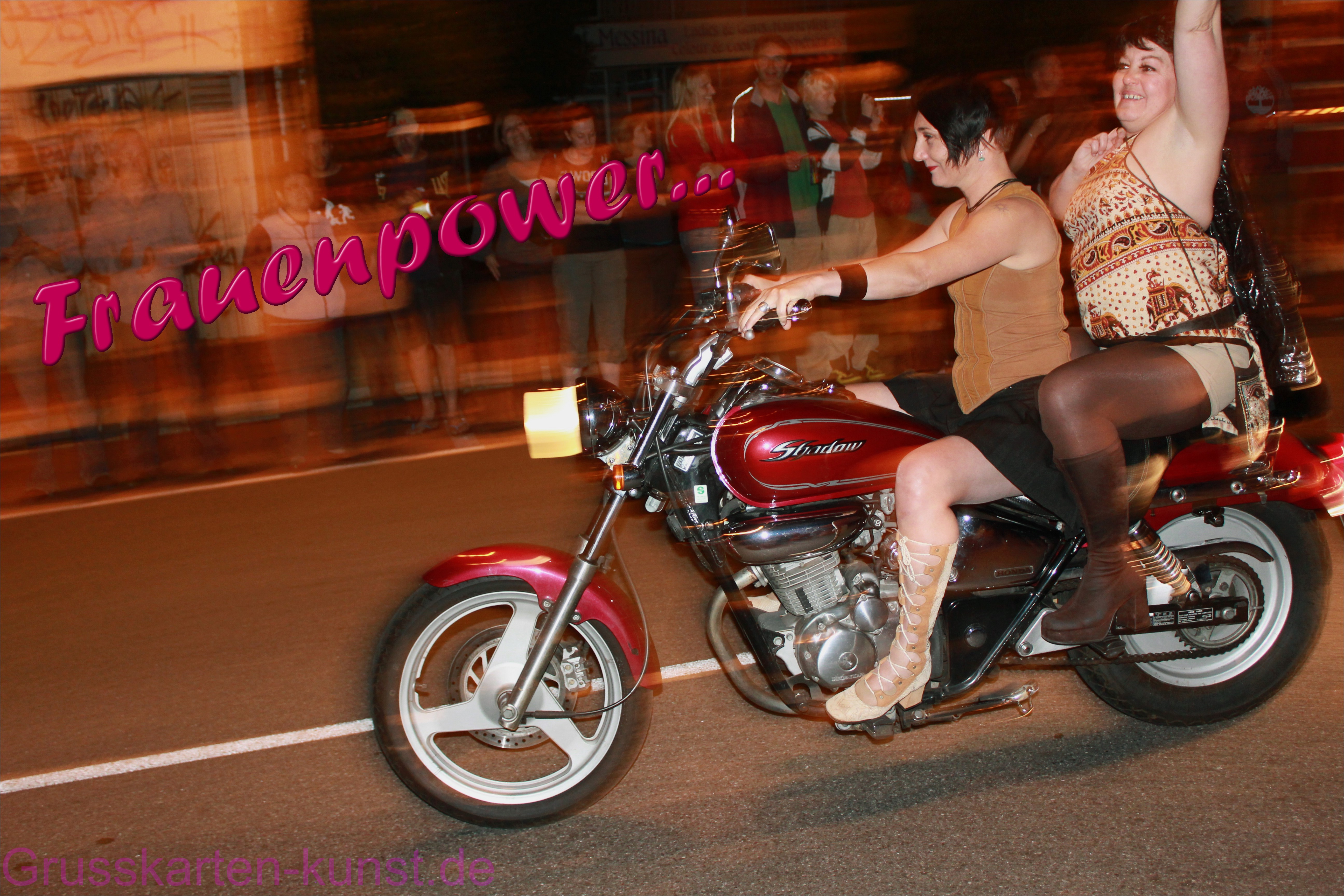 | C16 "Frauenpower" steht schräg in geballter, pinker Schrift auf dieser Karte. Diese zeigt zwei Frauen in "heißen" Klamotten auf einem heißen Ofen, nämlich einem roten Motorrad, in einer nächtlich beleuchteten Straße. Die Fahrerin schaut entschlossen verschmitzt in Fahrtrichtung und hält den Lenker mit gestreckten Armen. Sie hat lange braune Stiefel, kurze schwarze Haare, einen ebensolchen Rock und eine braune Weste an. Ihre Lippen sind rot geschminkt. Dahinter sitzt froh jauchzend eine kräftige Frau, die ihren nackten Oberarm in die Luft reißt. Auch sie hat braune Stiefel und ein Top an, dazu trägt sie blickdichte schwarze Nylonstrümpfe und einen kurzen Hosenrock. Zwei Powerfrauen, die Dynamik, Lebenslust und Entschlossenheit ausstrahlen. Dieser Ausdruck wird durch die Kameraführung unterstützt. Männer: zieht euch warm an ! Frauenpower macht Männer sauer ? Viel Spaß beim Versenden, Mädels..... Mail mit der Karte C16 versenden Karte C16 bestellen Karte C16 vergrößern | |