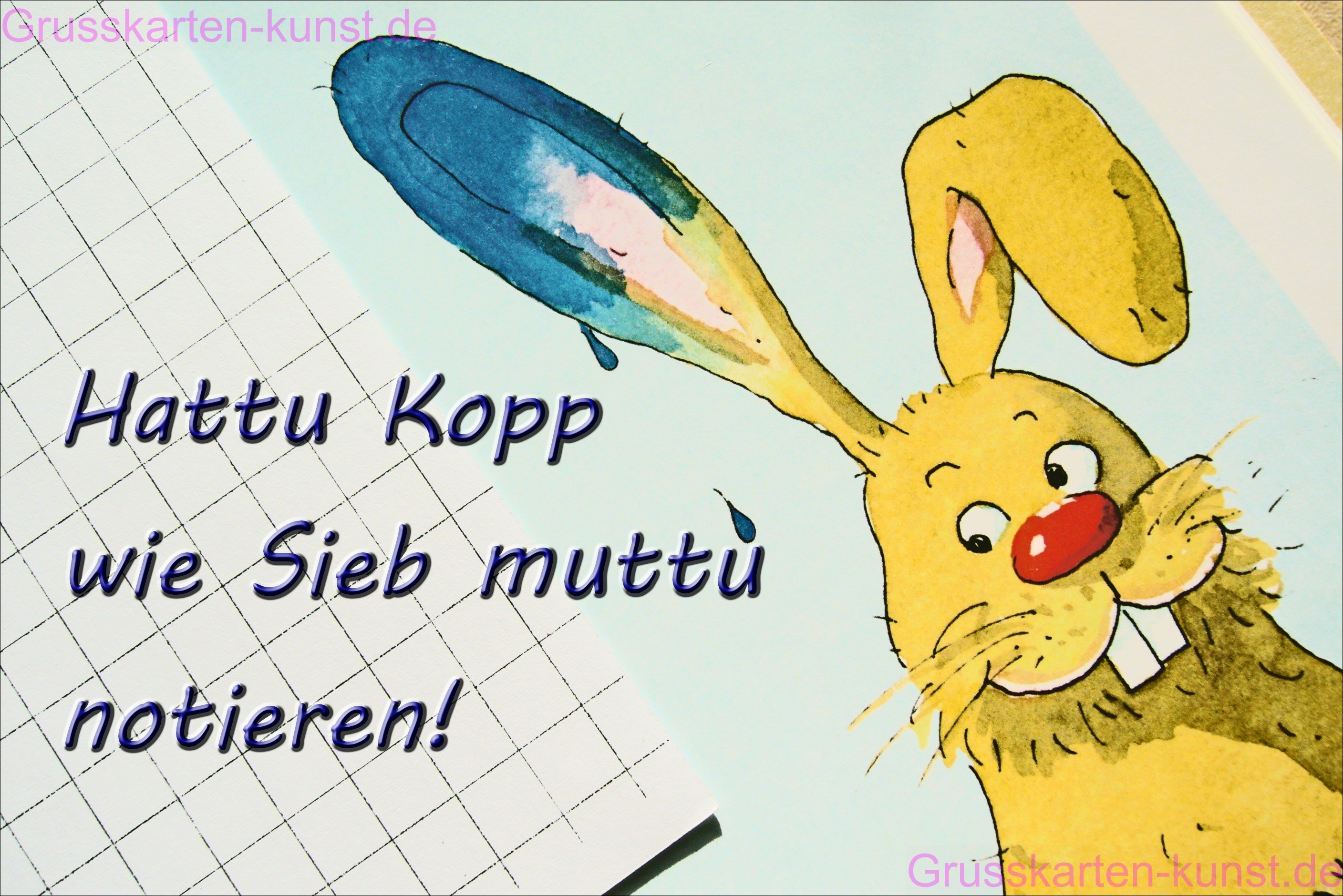 | C17 "Hattu Kopp wie Sieb, muttu notieren!" steht in Blau an der linken Seite der Karte. Dort liegt Karopapier, auf dem etwas notiert werden kann. Von der rechten, unteren Ecke ragt ein gemalter, heller Hase mit einer Roten Nase diagonal nach links oben in den Ausschnitt. Ein Ohr ist nach unten geklappt, das andere ist an der Spitze bläulich eingefärbt. Mit den Kulleraugen und Hasenzähnen sieht er lustig-frech aus. Eine nette Art jemandem zu sagen.... Mail mit der Karte C17 versenden Karte C17 vergrößern | |