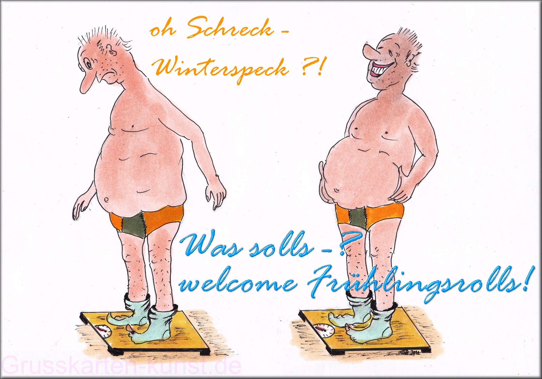 | C18 "Oh Schreck, Winterspeck?!" " Was solls ?- welcome Frühlingsrolls!" steht auf dieser "Karrikatur" die handgemalt wurde.(T. Schmidt) Sie zeigt einen bis auf die Unterhose entkleideten apfelförmigen Mann mit stacheligen Beinen und Socken mit Loch, der auf einer Waage steht und entsetzt die Anzeige betrachtet. Auf der rechten Seite der Karte lacht er herzlich und hält liebevoll seine "Wampe" fest. Die Waage zeigt das gleiche Gewicht. Manchmal macht eben nur die Wortwahl schon glücklicher...der orange-oliv gestreifte Schlüpper ist hammer ! Danke, Traudel! Mail mit der Karte C18 versenden Karte C18 vergrößern | |
