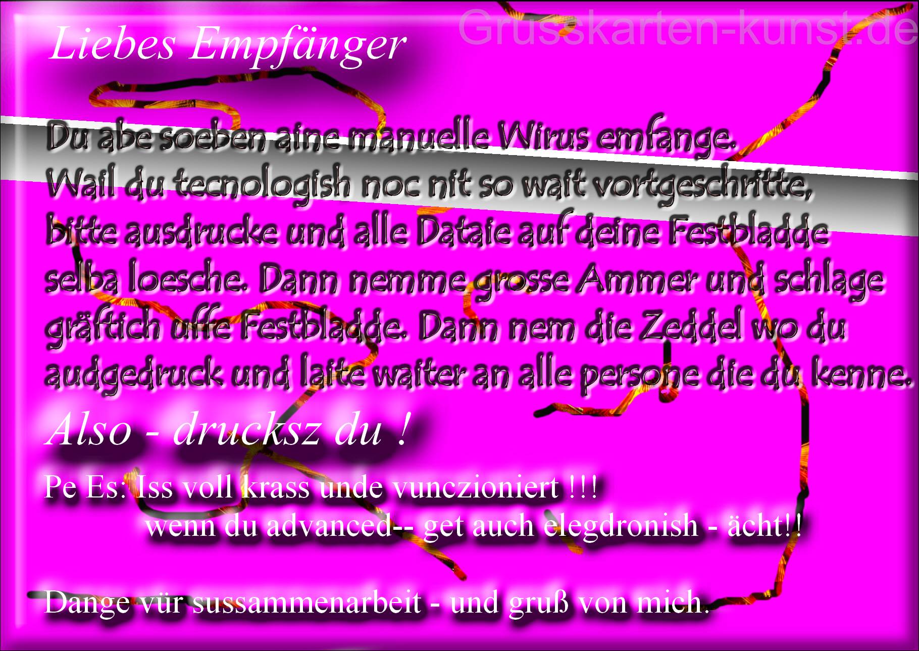 | C 19 Pinkfarbene Karte mit seltsam verworrenen Schlieren und grauen Mustern in Hintergrund (aber das spielt keine Rolle, sondern der Text): "Liebes Empfänger, du abe soeben aine manuelle Wirus emfange. Wail du tecnologish noc nit so wait vortgeschritte, bitte ausdrucke und alle Dataie auf daine Festbladde selba loesche. Dann nemme grosse Ammer und schlage gräftich uffe Festbladde. Dann nemm die Zeddel wo du aufgedruck und laite waiter an alle persone die du kenne. Also - druckz du ! Pe Es iss voll krass unde vunczioniert!!! wenn du advanced- get auch elegdronisch - ächt !! Dange vür sussammenarbeit - und gruß von mich." Mail mit der Karte C19 versenden Karte C19 vergrößern | |