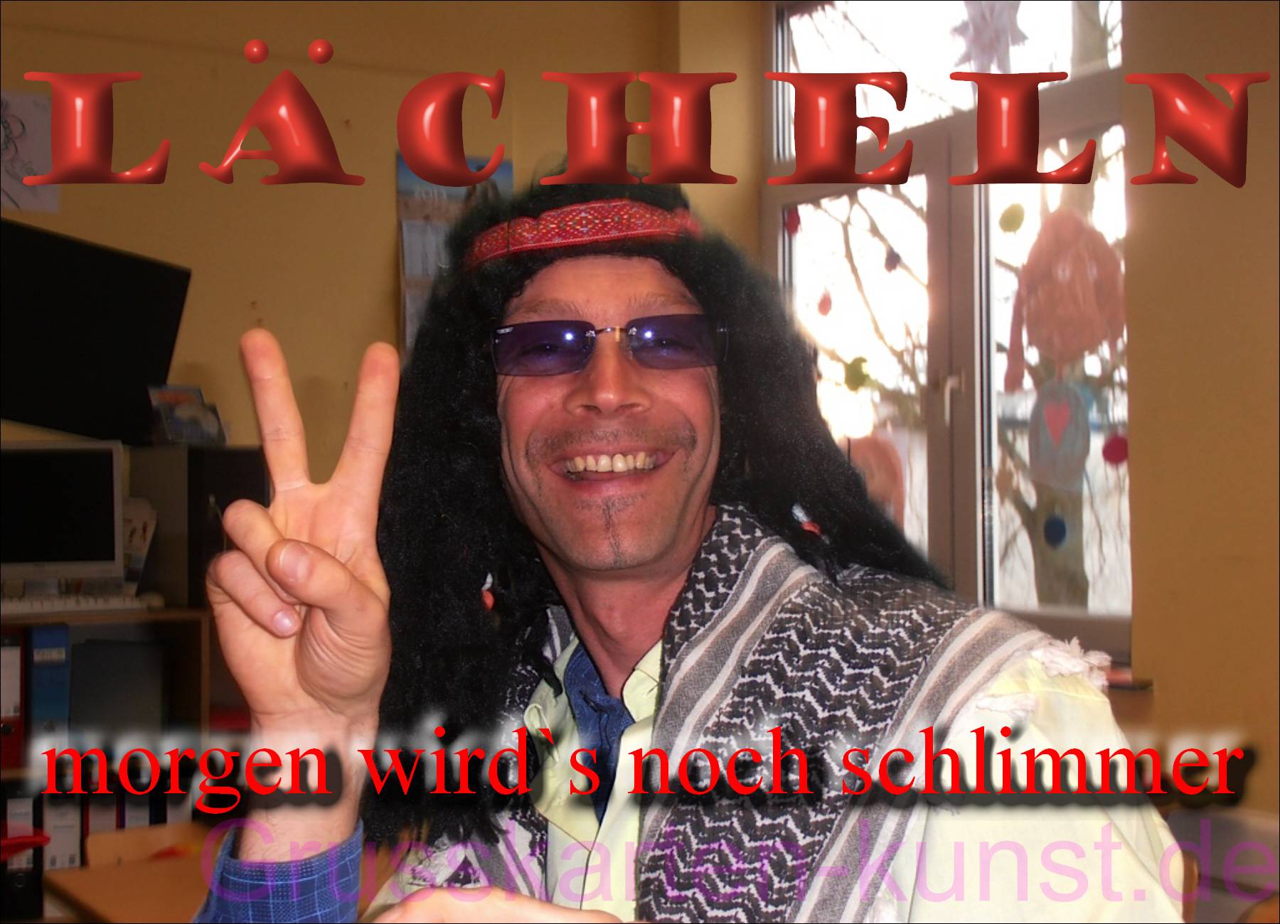 | C 20 "Lächeln.... morgen wird`s noch schlimmer" steht in Roter, großer Druckschrift am oberen und unteren Rand der Karte. Zu sehen ist ein als Hippie verkleideter Mann, der lachend in die Kamera schaut und das Victory- zeichen macht. Zum Mitlachen, trösten, ärgern.... Mail mit der Karte C20 versenden Karte C20 vergrößern | |