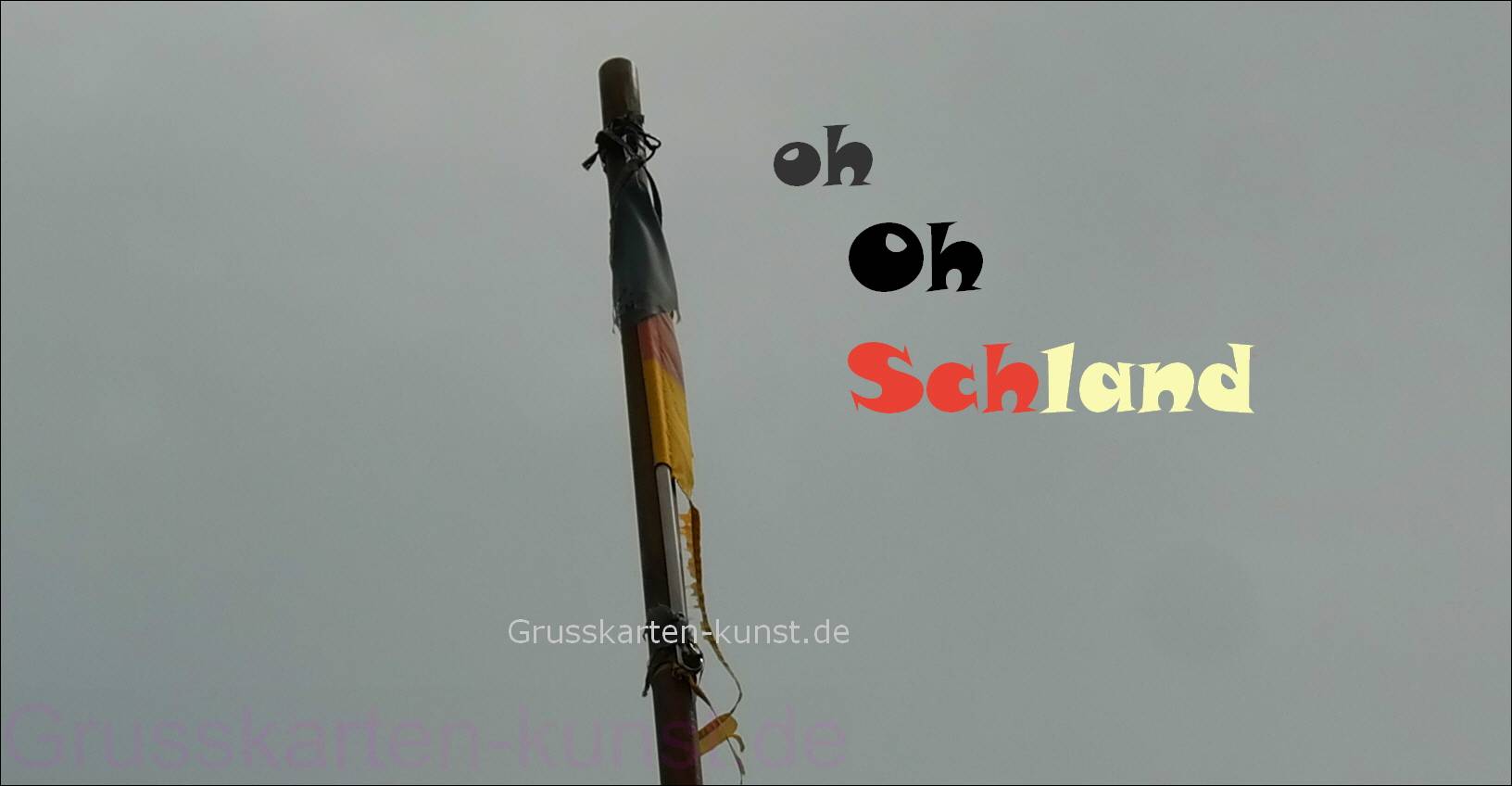 | C22 "oh, oh Schland" steht in schwarz rot goldener Schrift vor einem graubedeckten Himmel. Die ehemals wehende Deutschland Flagge besteht nur noch aus Mast und wenigen Zentimetern Stoffresten in den verblassten Nationalfarben. Viel Spaß beim Versenden. Mail mit der Karte C22 versenden Karte C22 vergrößern | |