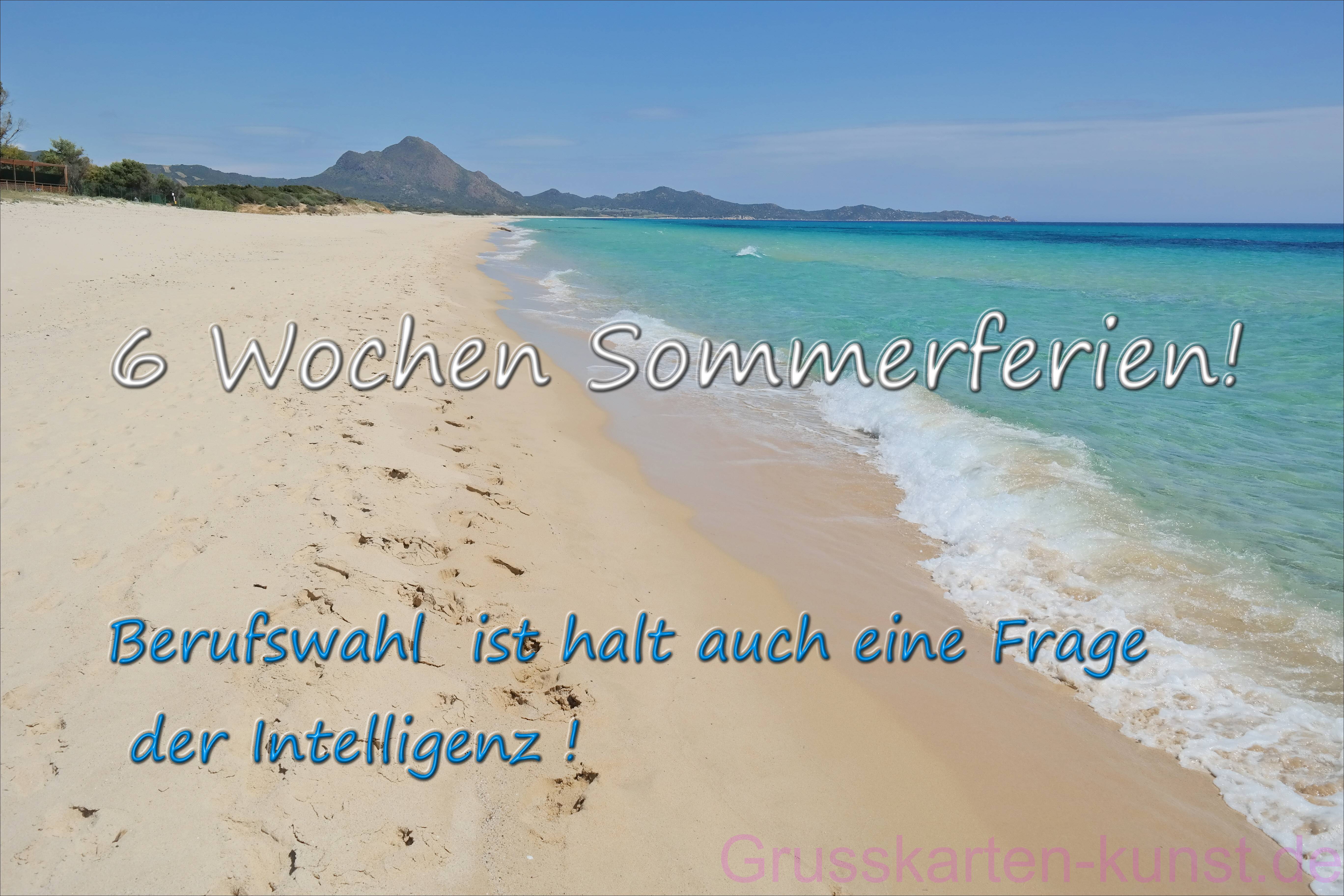 | C24 "6 Wochen Sommerferien!" steht oben auf der Karte. Darunter etwas kleiner: "Berufswahl ist halt auch eine Frage der Intelligenz!" Das alles vor einem menschenleeren, wundervoll, flachem Sandstrand mit Brandung, türkiesenem Meer, blauem Himmel und einem Felsen im Hintergrund. Einfach frech !. Mail mit der Karte C24 versenden Karte C24 vergrößern | |