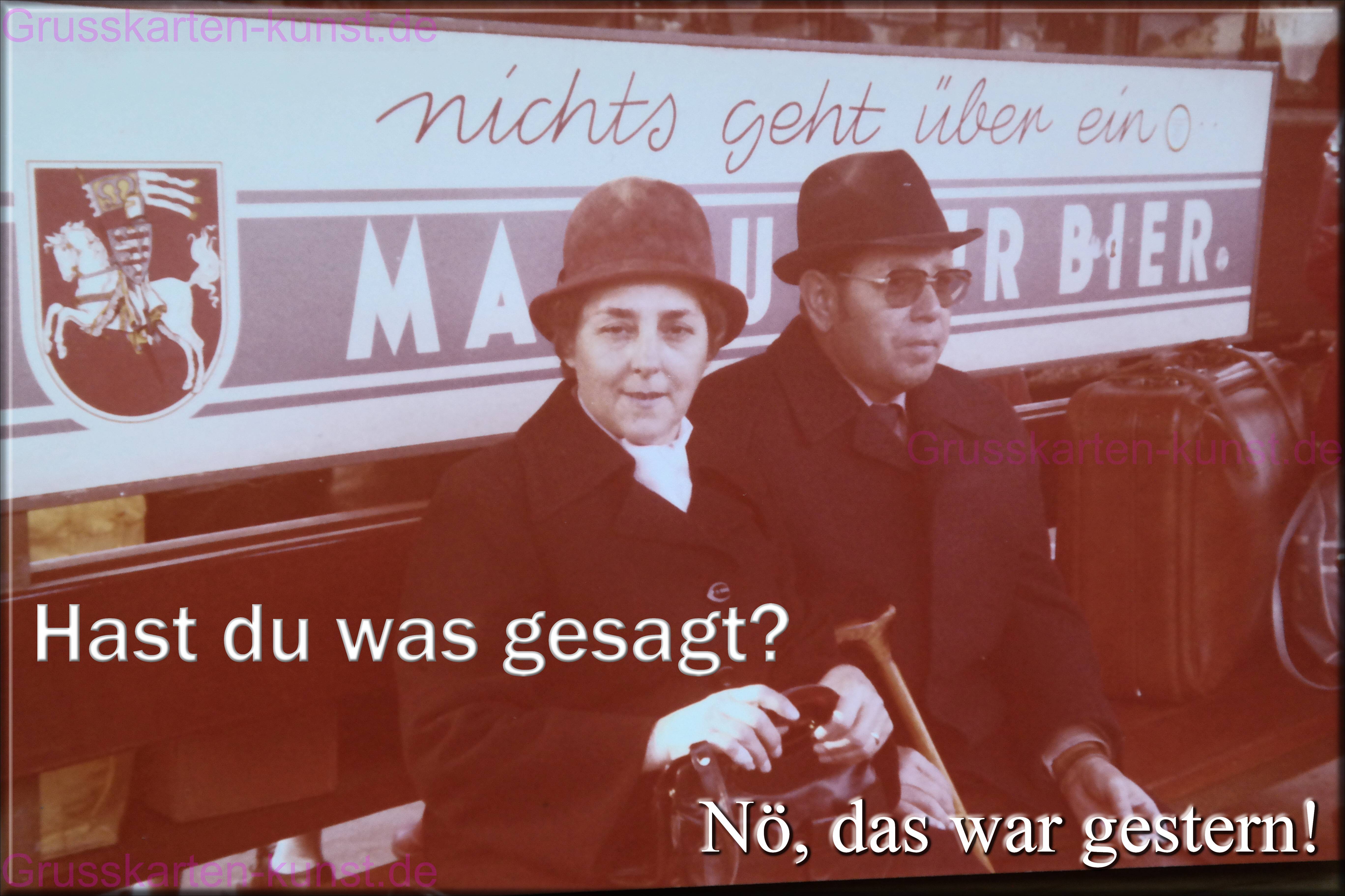| C25 "Hast du was gesagt?" - "Nö, das war gestern!" steht am unteren Rand der Karte. Eine verblichene, alte Karte auf der eine ältere Dame mit "Melonenhut" frech in die Kamera schaut und ein älterer Herr mit Sonnenbrille und Hut, der abwesend in die Ferne schaut, zu sehen ist. Beide sitzen mit Mantel nebeneinander auf einer Bank, sie hält eine Handtasche und er einen Stock. Hinter ihnen ein Werbeplakat mit der Aufschrift "Nichts geht über ein....Marburger" (leider gibt es ein marburger Bier nicht mehr) einfach hinreißend langweilig. Mail mit der Karte C25 versenden Karte C25 vergrößern | |