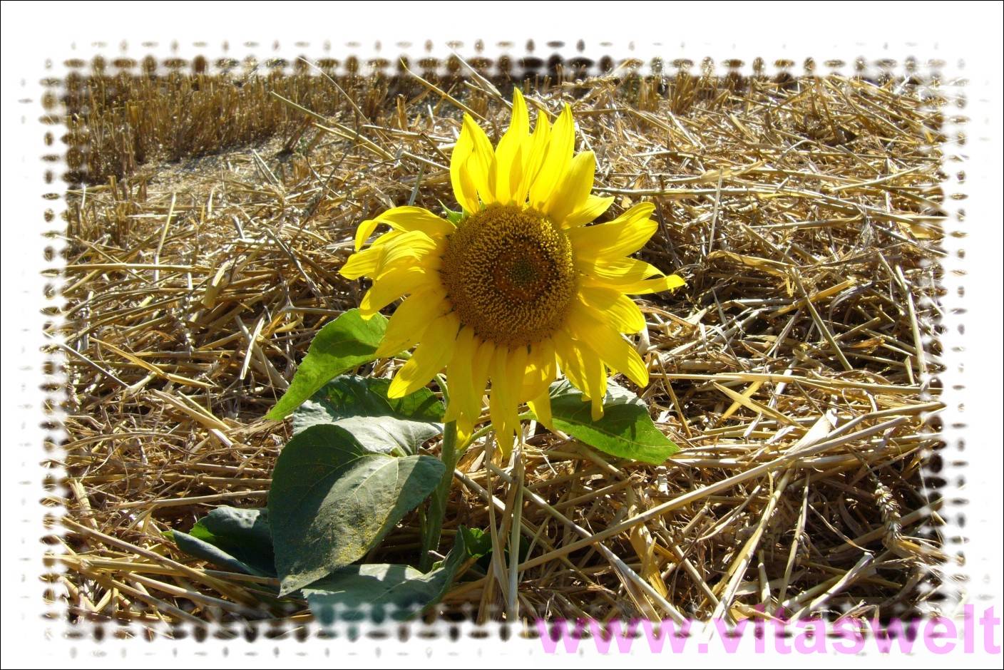 | T01 Eine Sonnenblume mit Stiel scheint aus einem Strohhaufen zu wachsen. Die Blütenbund die grünen Blätter des Stieles werden von der Sonne beleuchtet. Der Kartenrand ist wie kariert, was dem kreuz und quer liegendem Stroh einen weichen Ausklang zu geben vermag. Mail mit der Karte T01 versenden Karte T01 bestellen Karte T01 vergrößern | |