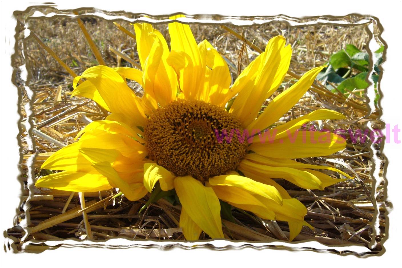 | T02 Ein leuchtend gelber Sonnenblumen“kopf“ liegt auf einem Untergrund aus Stroh. Ich habe leicht schräg von unten fotografiert. Von hinten scheint die Sonne gegen die sich überlappenden, strahlenförmig schmalen Blütenblätter. Dadurch scheinen Licht und Schatten mit der Pflanze zu spielen. Der gelbe Fruchtstand in der Mitte wird beschattet, was einen schönen Kontrast bildet. Der Kartenrand ist mit einer zierlichen, weißen Linie gestaltet. Mail mit der Karte T02 versenden Karte T02 bestellen Karte T02 vergrößern | |