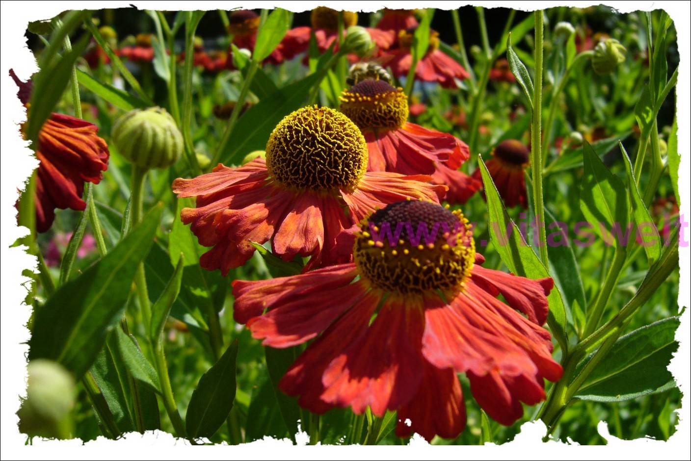 | T03 Drei Sonnenbrautblüten reihen sich im Zentrum der Karte hintereinander auf. Die reichhaltige hellgrüne bis dunkelgrüne Belaubung wird von Sonnenlicht durchflutet. Hier und da sieht man geschlossene Knospen und im unscharfen Hintergrund weitere offene Blüten. Diese sind rostorange und rostrot. Die schmalen, sich überlappenden Blütenblätter drängeln sich strahlenförmig um eine kugelige Mitte, die, wie ein Kopf in die Luft steht. Dieser lockende Pollenstand ist mit feinem gelben Blütenstaub auf dunkelrotem Grund benetzt. Spätsommerliche bis herbstliche Farbenpracht. Kartenrand ist wie "abgerissen". Mail mit der Karte T03 versenden Karte T03 bestellen Karte T03 vergrößern | |
