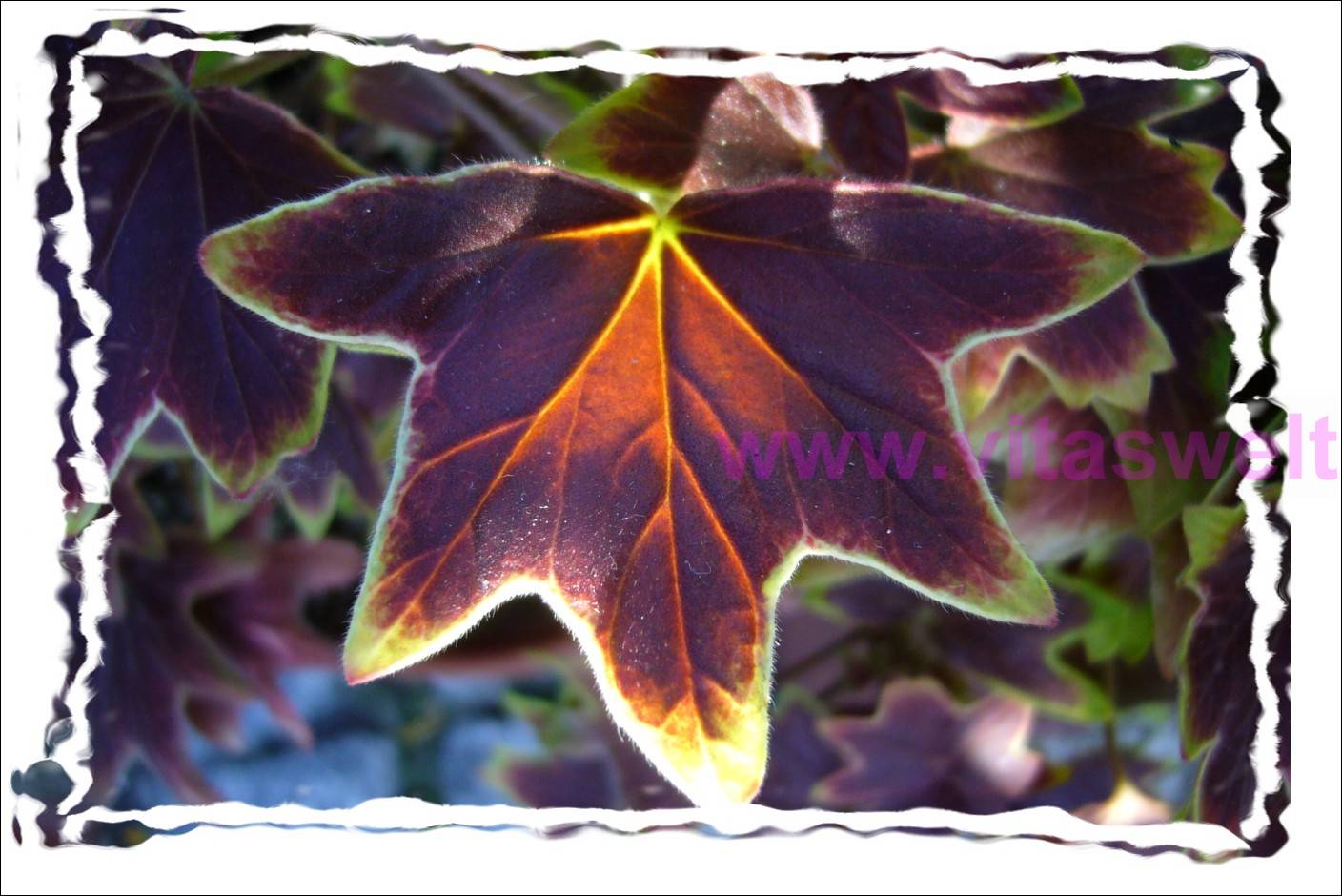 | T04 Ein überwiegend dunkelrotes Blatt mit 5 Zacken wird seitlich von der tiefstehenden Sonne beschienen. Da das Blatt nicht flach, sondern etwas gewellt ist, entsteht ein schönes Farbspiel. Gut sichtbar sind so die grünen, wasserführenden Blattadern, die sich zu den Spitzen hin verzweigen. Der Blattrand ist zierlich gelb-grün. Eine Geraniensorte mit besonderer Belaubung.Kartenrand uneben, wie verwackelt. Mail mit der Karte T04 versenden Karte T04 bestellen Karte T04 vergrößern | |