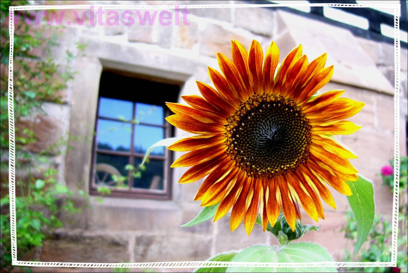 | T05** Eine orange-rote Sonnenblume mit etwa 40 gelben Spitzen und rötlich brauner Mitte lacht in die Kamera. Im etwas unscharfen Hintergrund steht ein Sandsteingebäude mit Fachwerkbau. Links von der Blüte sieht man ein gekipptes Fenster, wodurch sich der blaue Himmel in diesem spiegelt. Im Fenster steht ein altes Holz-Rad. Ein zusätzlicher weißer Rahmen hebt die Ansicht. Fotografiert auf einem alten Gutshof. Mail mit der Karte T05 versenden Karte T05 bestellen Karte T05 vergrößern | |