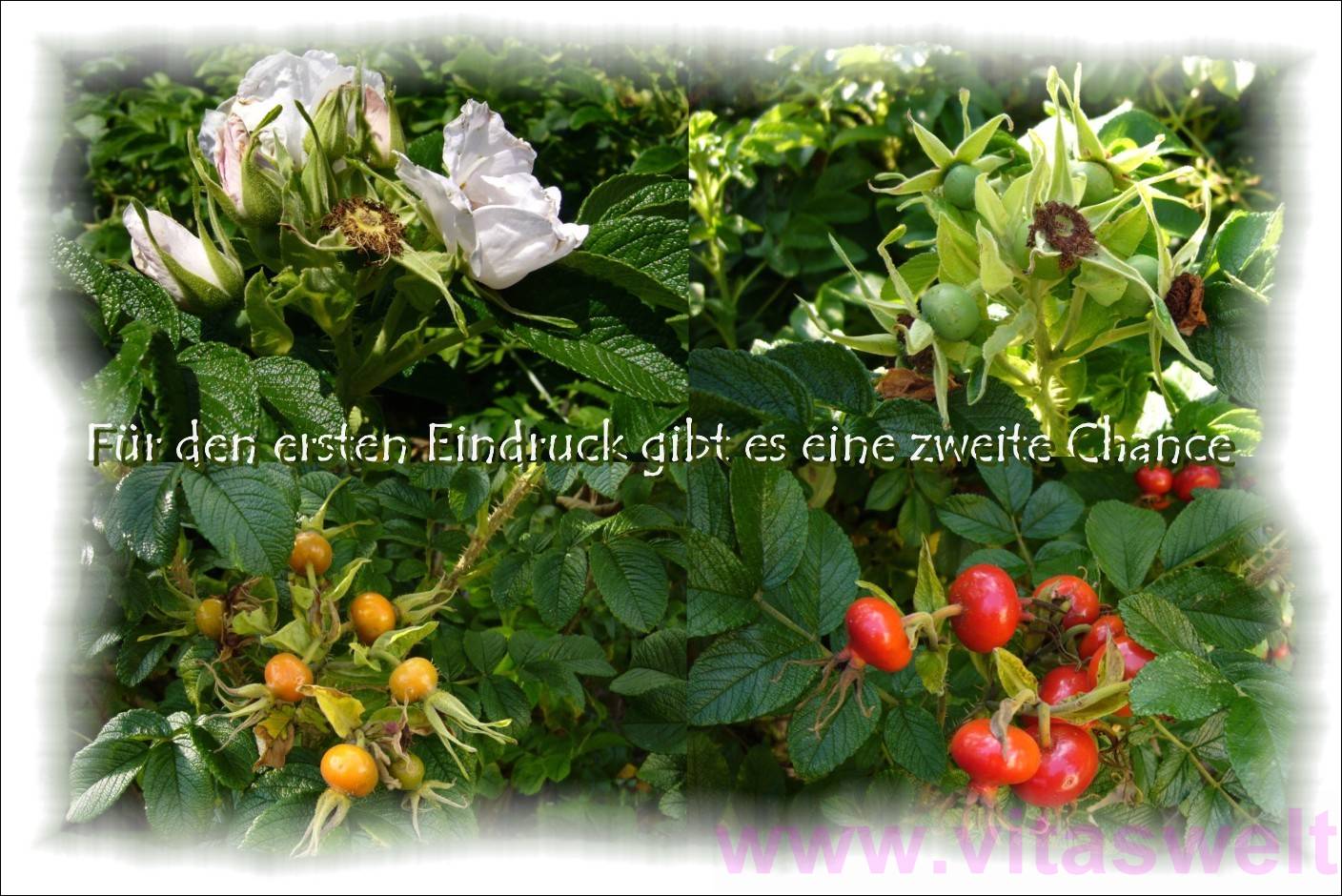 | T07 „Für den ersten Eindruck gibt es eine zweite Chance“ Grün gehaltener Text mit weißem Schatten inmitten der Karte. Diese ist in 4 Teile aufgeteilt. 4 Fotos zeigen die Entwicklung einer wilden Rose (Hagebutte) von der Blüte (weiß) bis zur bildung einer grünen haselnussgroßen Frucht und zur Färbung dieser ins orange und schließlich rot. Ich habe die Fotos etwa im Abstand von einem Monat, beginnend im Mai, gemacht. Eine Hagebuttenblüte hat jeweils am Ende eines Triebes mehrere Blütenansammlungen und so häufen sich auch die roten, leuchtenden Früchte auf dem letzten Bild. Der übergang von den Bildrändern ist scharf. Die etwa gleiche Grünfärbung der umliegenden Blätter vermittelt auf den ersten Eindruck eine Einheitlichkeit. Der Kartenrand ist blasser werdend. Mail mit der Karte T07 versenden Karte T07 bestellen Karte T07 vergrößern | |