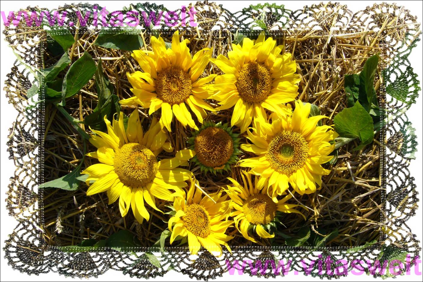 | T08** Um den Fruchtstand einer Sonnenblume ohne Blüten habe ich 6 Sonnenblumen zu einem Kreis gelegt. Alles zusammen liegt auf einem mit Stroh bedecktem Acker. Die Sonne strahlt die Blüten und die grünen Blätter von schräg oben an. Mit dem Computer habe ich den Rand des Fotos als halbkreisförmige Spitzendecke gestaltet. So sieht das ganze aus, als wäre es ein festliches Tischarrangement. Mail mit der Karte T08 versenden Karte T08 bestellen Karte T08 vergrößern | |