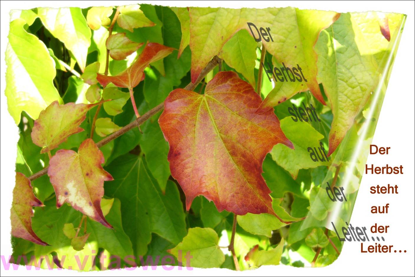 | T09 "Der Herbst steht auf der Leiter..." steht unten rechts wie Leitersprossen in brauner Schrift untereinander geschrieben. Ein Schatten dieses Spruches neigt sich nach links in das Bild hinein, so dass es aussieht, als ob eine Leiter schräg angelehnt würde. Das Bildmotiv zeigt noch saftig grüne Weinblätter, die von der Sonne teilweise beschienen werden. In der Mitte dieser leicht gezackten Blätterwand befindet sich ein schon rot gefärbtes Blatt. Das Gedicht geht weiter: ... und malt die Blätter an. Ein lustiger Waldarbeiter, ein froher Malersmann..."(P.Hacks) Mail mit der Karte T09 versenden Karte T09 bestellen Karte T09 vergrößern | |