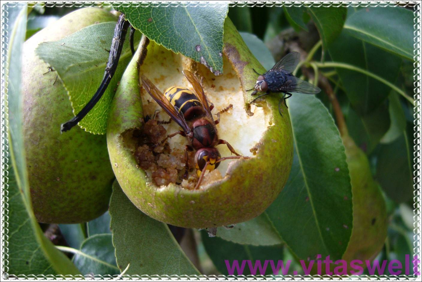 | T10 Auf der Suche nach einem Motiv fand ich diesen Birnbaum. Erst wollte ich nur die Birnen fotografieren, stieß dann aber zufällig auf diese eine Birne, in die schon zur Hälfte ein "Krater" geknabbert wurde. Der Übeltäter sitzt noch drin. Nämlich eine Hornisse, die fleißig schabt. Am Rand des "Kraters" sitzt ein weiterer Schmarotzer. Eine Schmeißfliege. Rundherum befinden sich grüne Blätter und der Kartenrand ist zart verziert. Geduld wird belohnt. Mail mit der Karte T10 versenden Karte T10 bestellen Karte T10 vergrößern | |