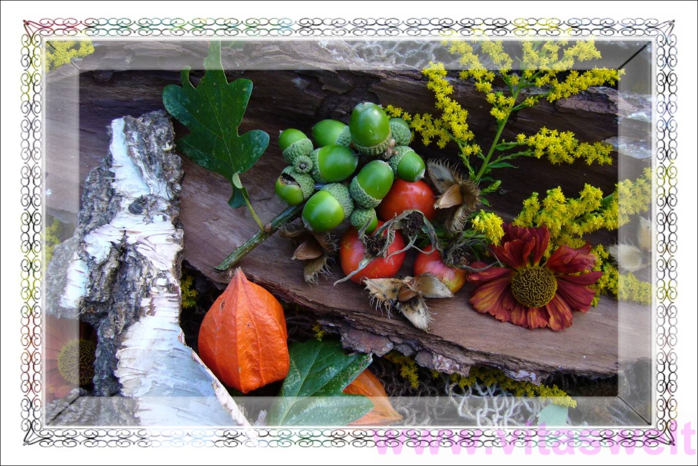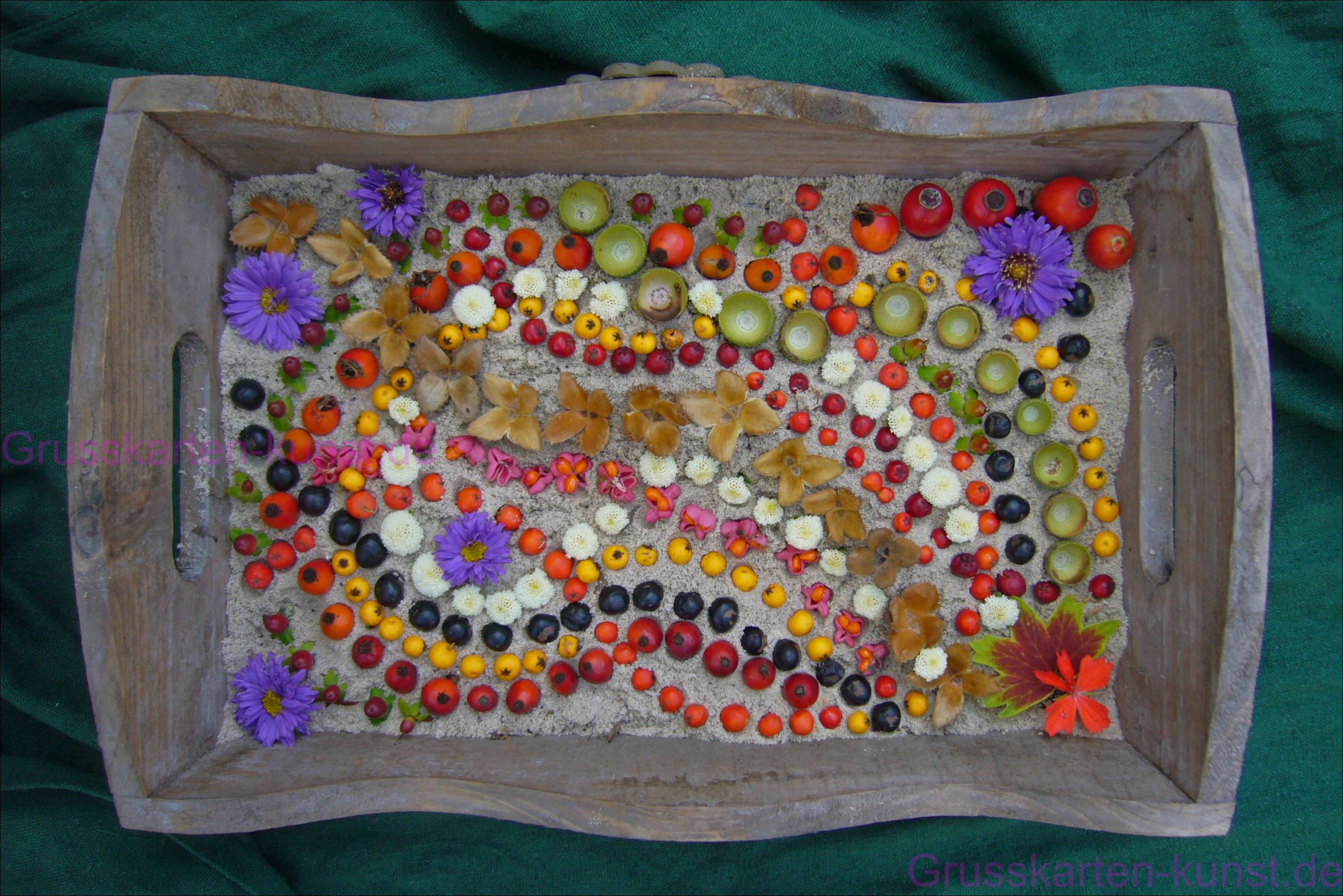 | T33 ** In eine verwitterte, Tablettähnliche Holzschale ließ ich feinen Sand rieseln. Die Fläche dekorierte ich schlangenlinienartig mit den verschiedensten Früchten von Büschen und Bäumen. So ergibt sich ein buntes, wellenähnliches Muster aus den Farben rot, orange, gelb, braun, schwarz, lila, weiß, rosa, grün. Zum Beispiel sind die Kelchförmigen Schalen von Eicheln, die sternförmigen Hülsen von Bucheckern und einige lilafarbene Blüten von Astern dabei. Das Runde im Eckigen? Farbenfroh, frisch, inspirierend. Mail mit der Karte T33 versenden Karte T33 vergrößern | |