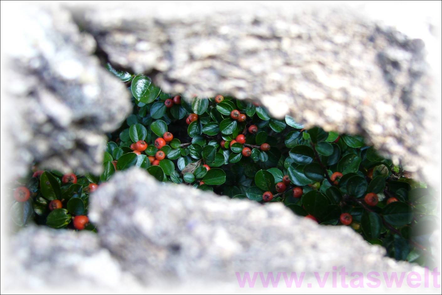 | T12 Hier fotografierte ich durch die aufgeplatzte Rinde einer alten Birke, die unscharf den Rand der Karte bezeichnet. Durch den ungleichmäßig gerissenen Spalt blickt man auf die kleinen, dunkelgrünen Blättchen einer Kriechmispel, die im Frühling weißlich blüht und jetzt im Herbst rote, kleine beerchen trägt. Schräg beleuchtet die Sonne diese kontrastreiche Ansicht. Mail mit der Karte T12 versenden Karte T12 bestellen Karte T12 vergrößern | |