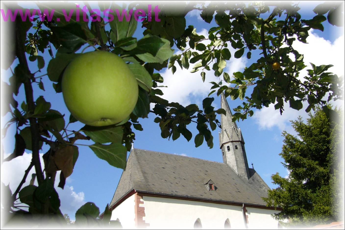 | T13 Ein wenig an Erntedank erinnert dieses Motiv, bei dem ich durch die Blattkrone eines Apfelbaumes in den blauen Himmel fotografiert habe. Ein knallig grüner Apfel hängt im Vordergrund, während sich im Hintergrund eine Schiefergedeckte Kirche und deren Kirchturm zeigt. Ungewöhnliche Perspektive mit klaren Farben. Mail mit der Karte T13 versenden Karte T13 bestellen Karte T13 vergrößern | |