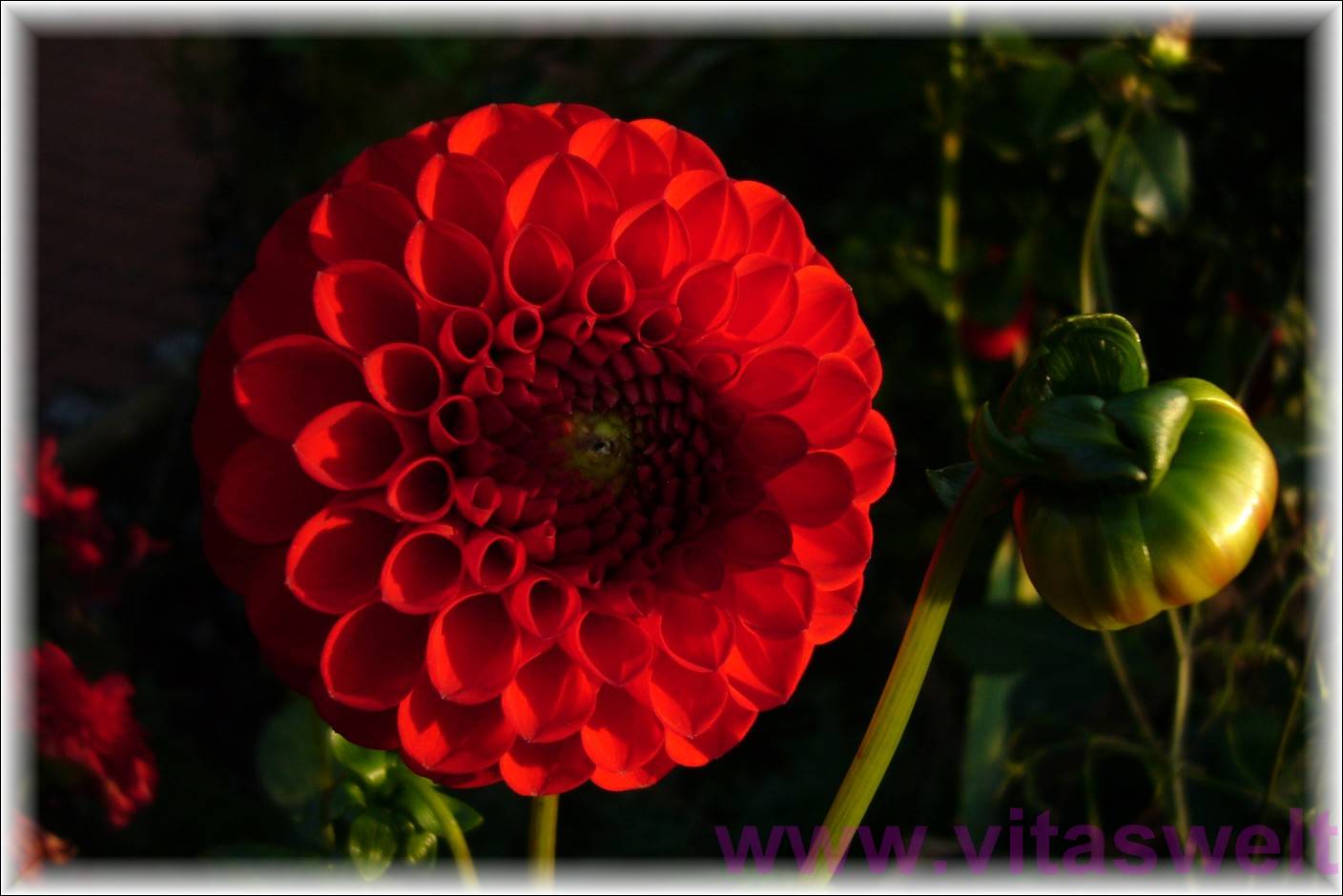 | T14 Im tiefstehenden, warmen Sonnenlicht ragt eine kugelrunde, rote Dahlienblüte in die Kartenmitte. Die einzelnen Blütenblättchen, die wie Trichter geformt, hundertfach dicht an dicht diesen Ball ergeben, werden von Licht und Schatten in Szene gesetzt. Am rechten Bildrand ragt eine noch geschlossene und grüne Knospe ihren Kopf in das Bild. Sie steht der Sonne zugewand, sodass sie einen hellen Glanz bekommt. Der Schatten dieser Knospe zeigt sich im Mittelpunkt der offenen Blüte. Der Hintergrund ist dunkelgrün mit leichten Farbflecken von weiteren Blüten. Mail mit der Karte T14 versenden Karte T14 bestellen Karte T14 vergrößern | |